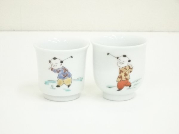 ys7366120; 有田焼 奥川俊右衛門造 色絵唐子遊文ぐい呑2客(共箱)【道】