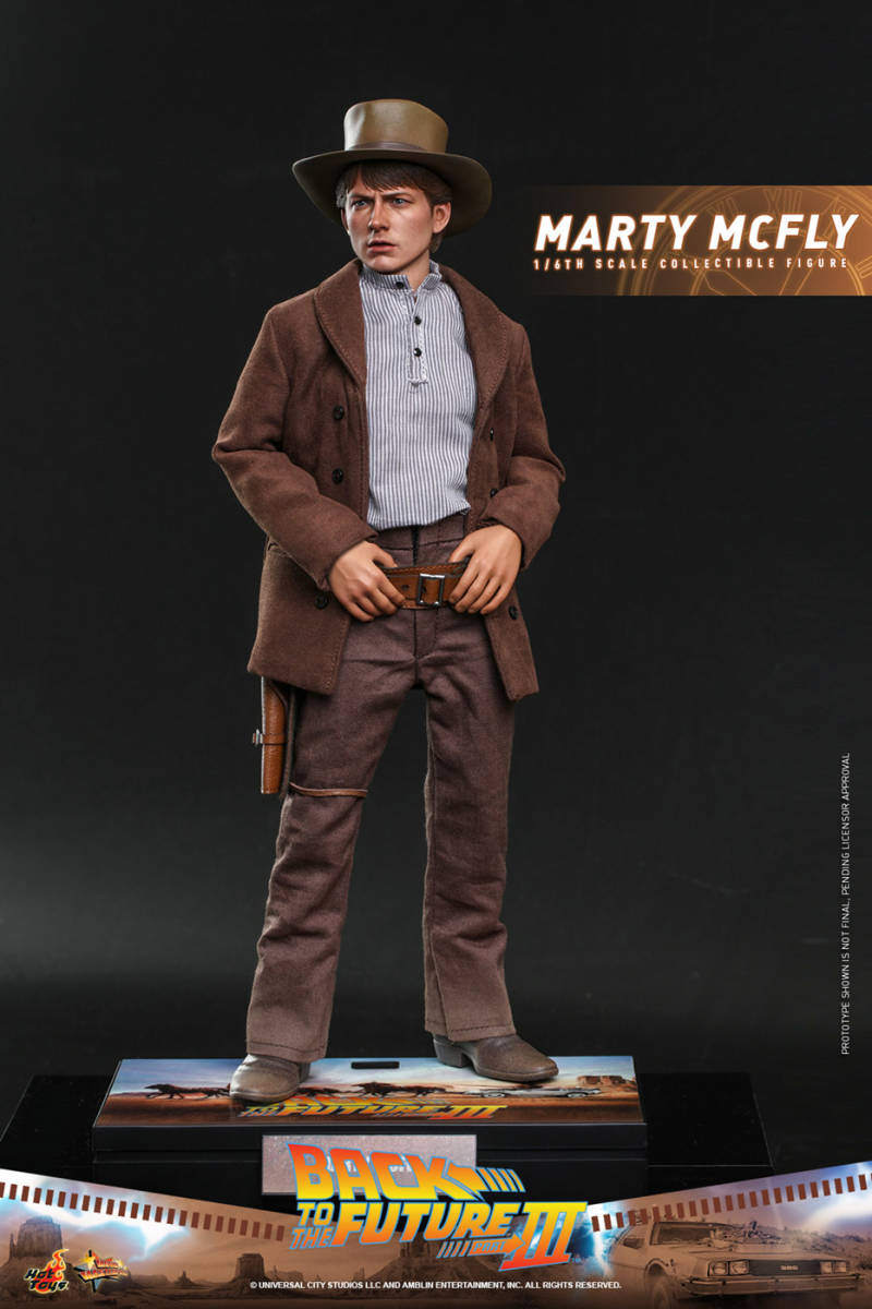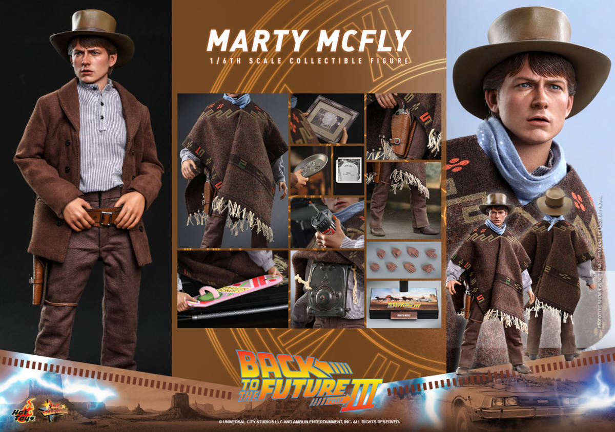 『バック・トゥ・ザ・フューチャー PART3』に登場するマーティ・マクフライを、全高約29センチ、30箇所以上が可動するハイエンドな1/6スケールのフィギュアとして立体化。新規造形となる、演じるマイケル・J・フォックスの肖像権をクリアした帽子を被ったヘッドは、皮膚の質感や皺、髪型などを再現すべく、一つひとつハンドペイントによる塗装が施されている。ダークブラウンのポンチョ、首に巻いたスカーフ、ライトブルーのストライプシャツ、銃弾とピストルのホルスターがついたベルトといった西部開拓時代の衣服は、ディテールや素材にこだわり抜き、質感に至るまで精巧な仕上がり。ポンチョとスカーフは着脱でき、ブラウンのブレザーに着せ替えることが可能だ。武器として、ピストルが付属。アクセサリーとして、首に掛けられる防弾用の鉄板、パイの皿、ドクと写る大時計の写真が入った額縁、マーティが1885年へ向かうきっかけになった墓石の写真、ホバーボード、通信機が付属する。多彩な差し替え用ハンドパーツを併せて使用すれば、心に残る数々の名シーンを演出することができるぞ。台座は、作品のロゴなどがデザインされた特別仕様だ。
