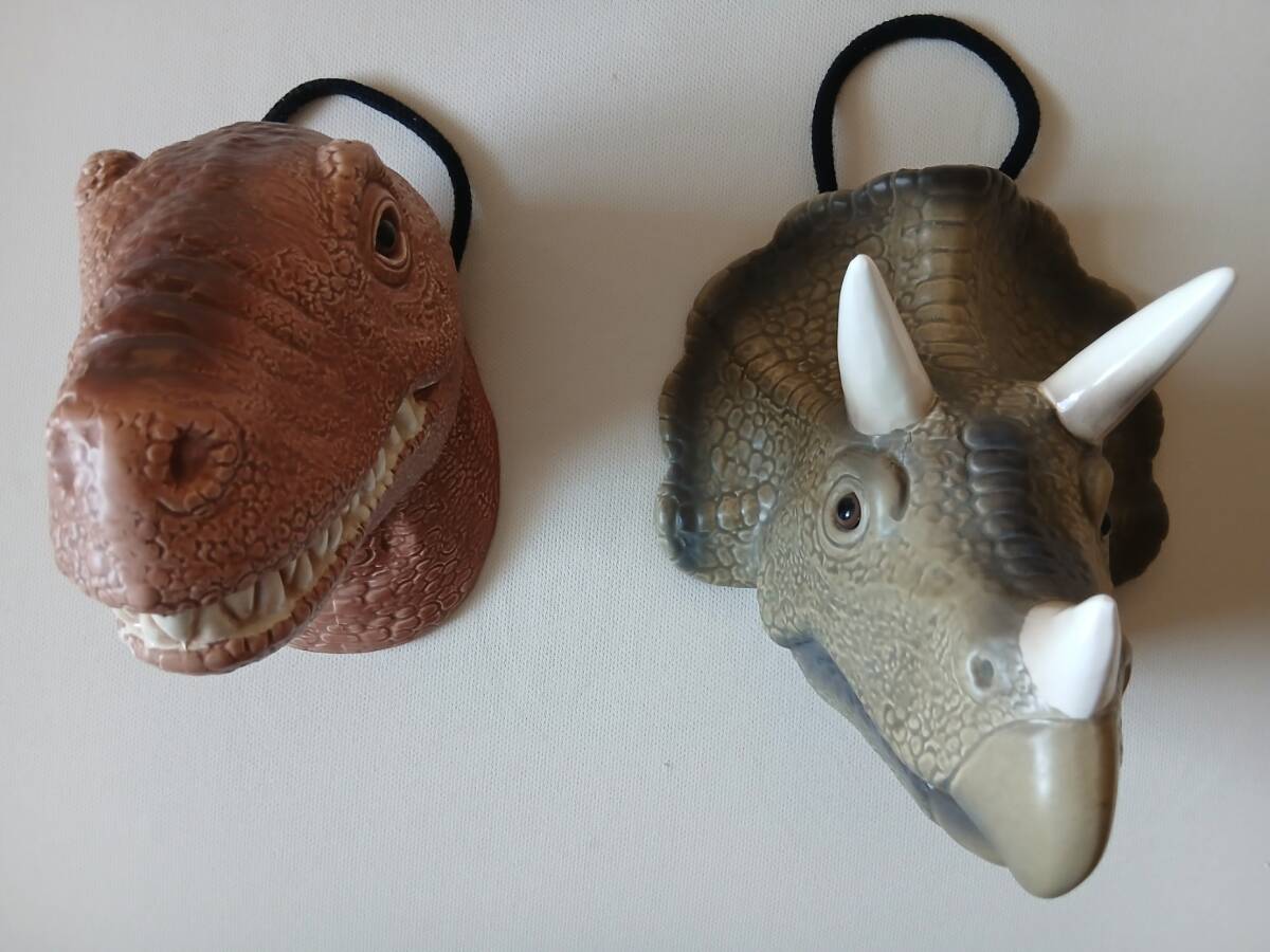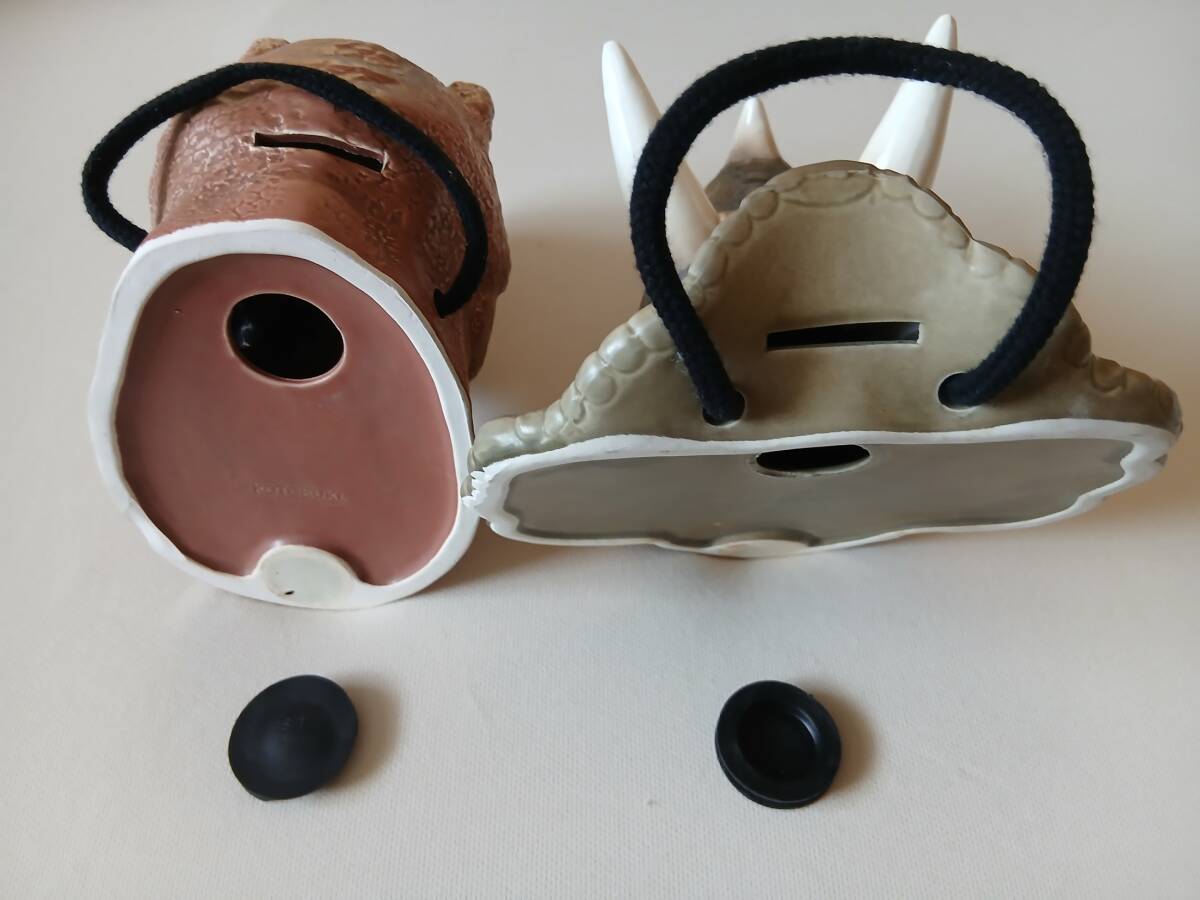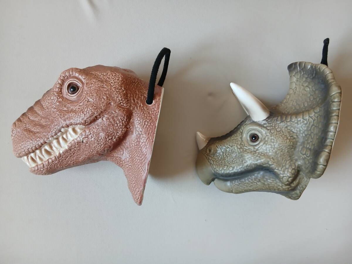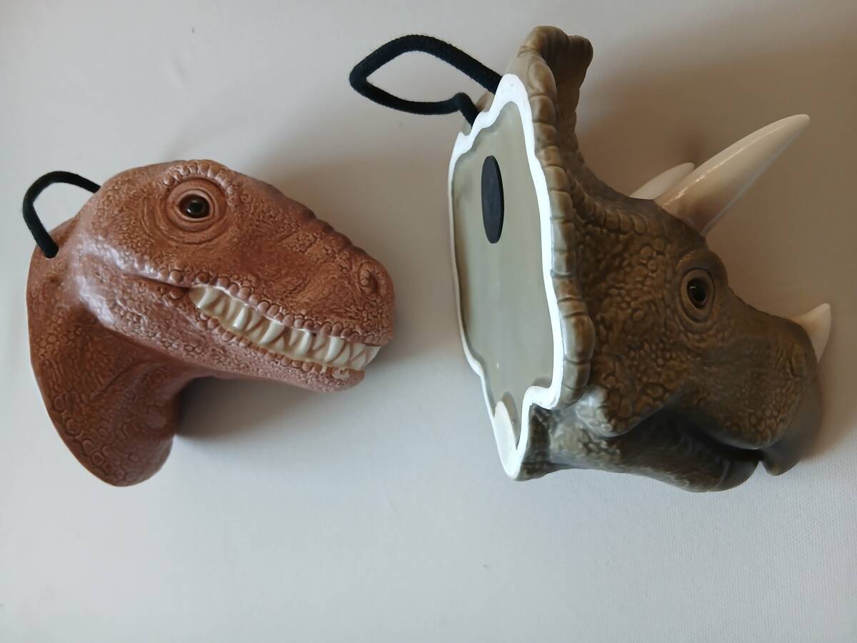 ★恐竜 壁掛け貯金箱2種セット です。口先から首の長さは、約16~18cmです。今から25年以上前に部屋に飾っていましたが、引っ越しを機に屋根裏部屋で今日まで眠っていた陶器製の品です。なにぶん古い品ではありますが、画像の通り、状態的にはさほど悪い感じはありません。以上のことをご承知の上でご入札ください。