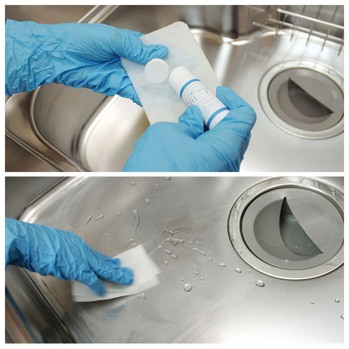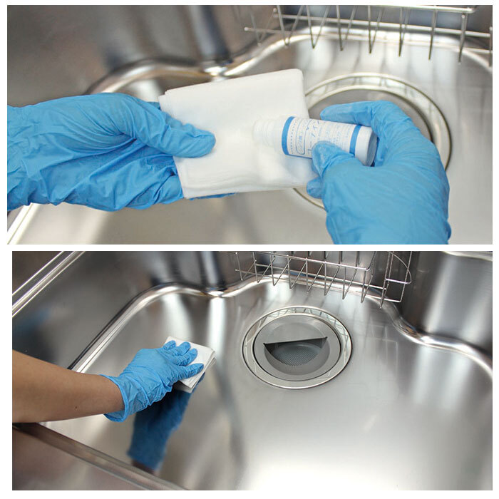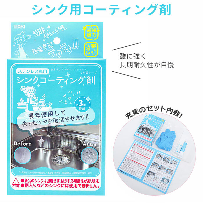 商品説明 | ・シンクのキレイを3年キープする!プロ仕様のシンク用コーティング剤(クリーナー付)が登場。 ・シリコン樹脂とフッ素樹脂の利点を併せ持った、ハイブリッド型のコーティング剤。酸に強く、長期耐久性が自慢。 ・クリーナー(15ml)、コーティング剤(15ml)、クロス(1枚)、スポンジ(1枚)、手袋(2組)の充実のセット内容。 ・強力なプロ仕様クリーナーを付属のクロスにつけてこすると、長年の使用により蓄積した汚れや水垢もピカピカに! ・さらにコーティング剤を使うことで、ミクロの被膜がシンク表面の小さな凹凸をカバー!水を流すだけでスルッと汚れが落ちるように! ・※本製品はステンレスシンク専用です。 ・※コーティング剤が均等に塗布できないので、エンボス加工や模様の入ったシンクへのご使用はお止めください。 |