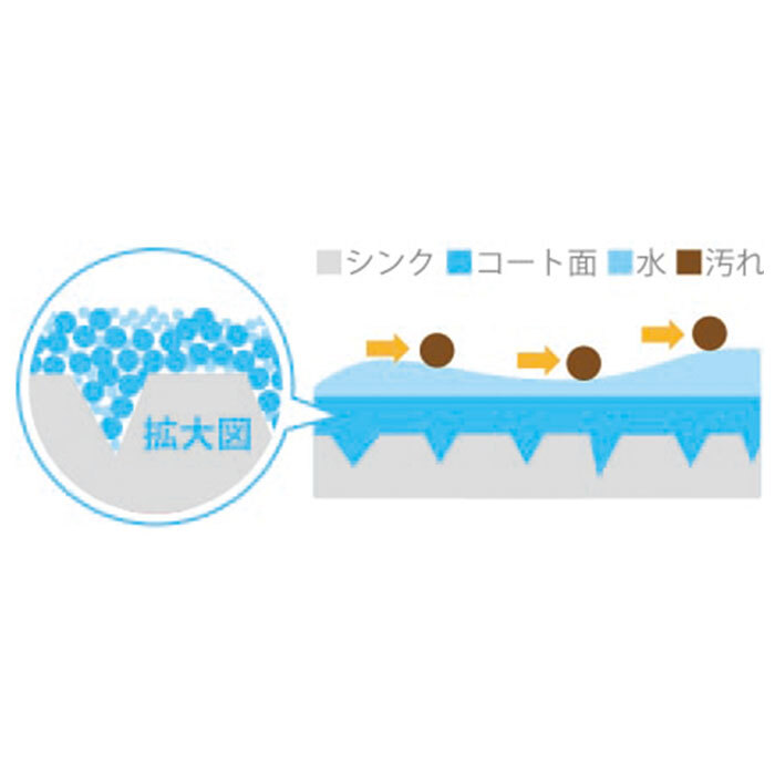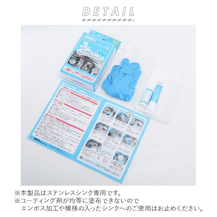 注意点 | [施工前のご注意] ※本製品はステンレスシンク専用です。古くなってツヤやはっ水が悪くなったシンクが対象です。 ※新品のシンクは固着せず、はがれる可能性があります。 ※柄入りなどのシンクには使用できません。 ※施工する前と比べ、仕上りの風合いが変わる事があります。 ※表面温度10度以下35度以上または湿度85%以上でのコーティング剤施工は避けてください。 ※一旦、コーティングを施工すると簡単に除去できませんので、ご注意ください。 ※事前に、目立たないところで試し塗りをして、コーティング剤が定着するかをご確認ください。 ※コーティング後は、シンク表面がザラザラする場合があります。予めご了承ください。 [安全上の注意] ※使用時、保管時は火気又は加熱を避け高温体との接近も避けてください。 ※コーティング剤は無臭ではありません。必ず換気してください。 ※皮膚や目に直接触れないように注意してください。万一、付着した場合は着衣や皮膚を水で洗浄し、目に入った場合は充分、水で洗い流して医師へご相談ください。 ※シリコン・フッ素複合系樹脂が主成分です。かぶれることがありますので、施工時には付属の手袋を必ず使用してください。 ※幼児や子供の手の届かないところに保管してください。 ※コーティング剤を廃棄する際はティッシュペーパーなどにコーティング剤をしみこませて可燃物として廃棄してください。 ※塩素系の漂白剤や排水管洗浄液などが直接かかるとコーティングが落ちる可能性がありますのでご注意ください。万一付着した場合は即時に水洗いしてください。 ※用途以外には使用しないでください。 ※カメラやモニターの性質により、画像と実物の色の違いがある場合がございますのでご理解願います。 |