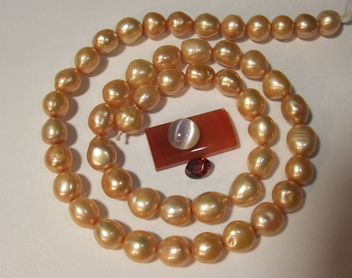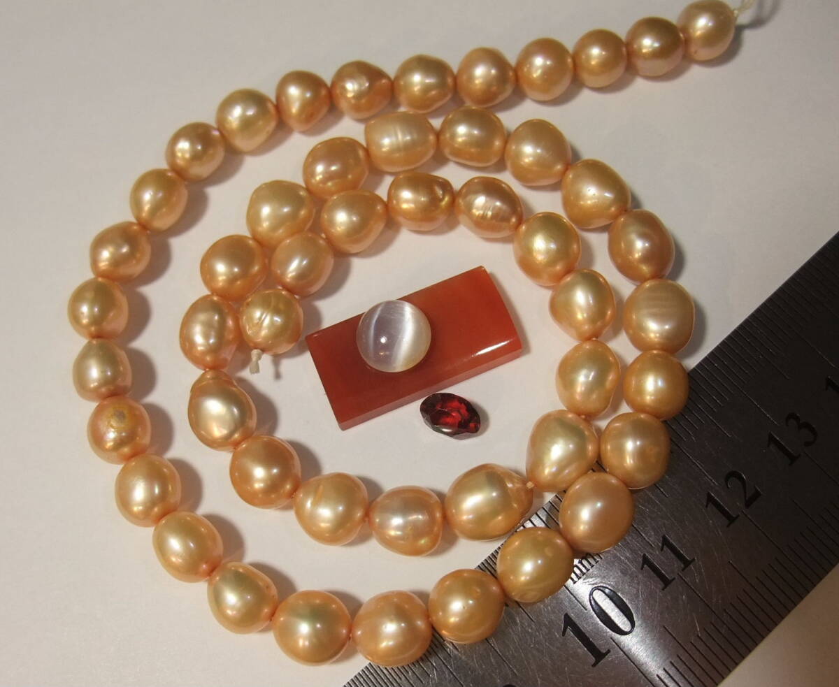 価格が高騰中の淡水パール、高品質でテリツヤ綺麗なカラー連材と、宝飾用ルースの未使用や外し石リユースのお得なセット出品です♪パールのシェイプはナチュラルのバロックで高品質なトリートメント処理の美しい連材で約40cm前後の使いやすいお素材です♪今ほどお値段が上がっていなかった頃の古い手持ちで、やや経年感や色むらキズスレなどもあるかと思いますがかなりお得な連材です☆セットのルースも未使用外し石等混ざりますが多少の難はあっても工夫次第で色々と使えてとってもお役立ちと思います♪