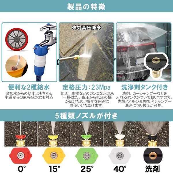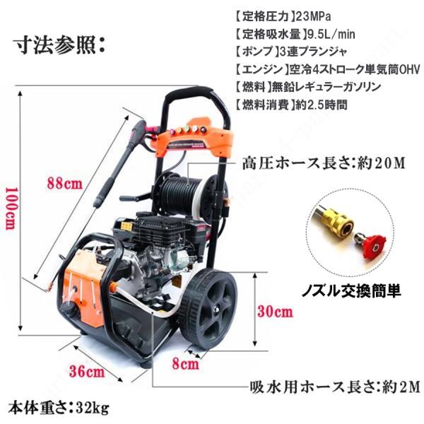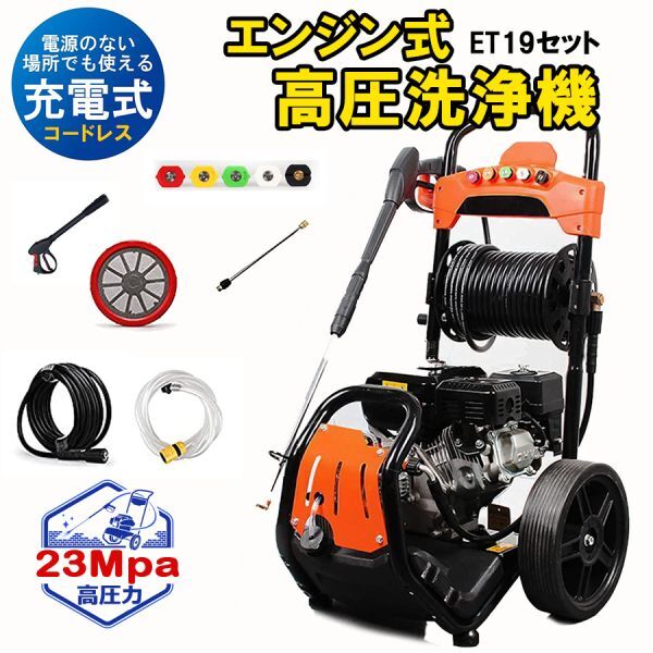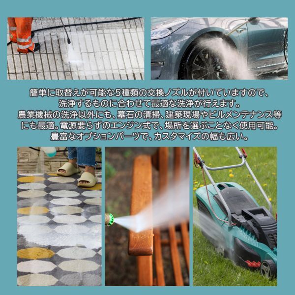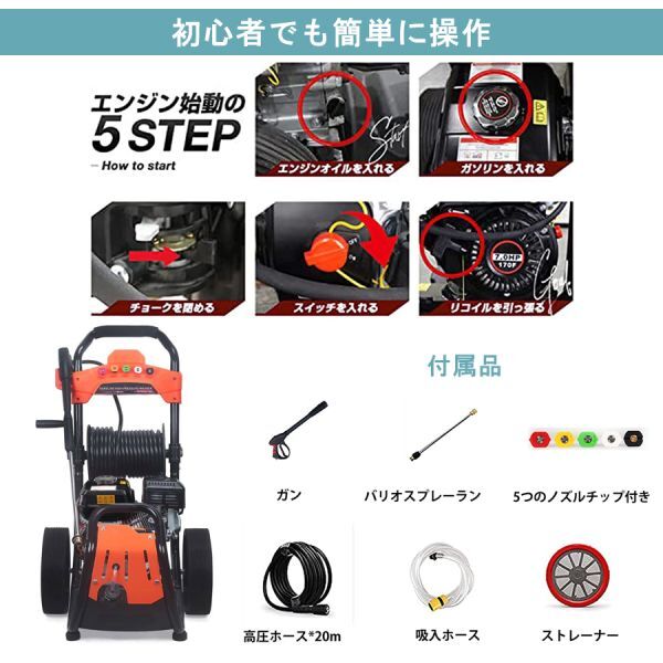 【ハイパワーで協力な高圧洗浄機】 高圧洗浄機 ホース20m 吸水ホース3m エンジン式なのでハイパワー 23MPaの高圧水で農機などのガンコな汚れも一掃できます。 【5つのノズルチップ付、幅が広い適用き】 0° 15° 25° 40° 65°用途によって使い分けができます。洗車、家屋壁洗浄、床、ドロ汚泥、泥洗浄、災害復旧など高圧から低圧の幅が広いため幅広い用途にお使いいただけます。 【便利な2種給水】 水道から直接吸水も可能 溜め水からの給水はもちろん水道からの直接給水にも対応 ※市販のホース又はワンタッチコネクタ付ホースをご用意ください(3m以内) 洗浄剤タンク付き 洗浄剤タンクと一体なので洗剤をセットすれば 洗剤洗浄もできます 洗車やひどい汚れの洗浄に最適です。 |