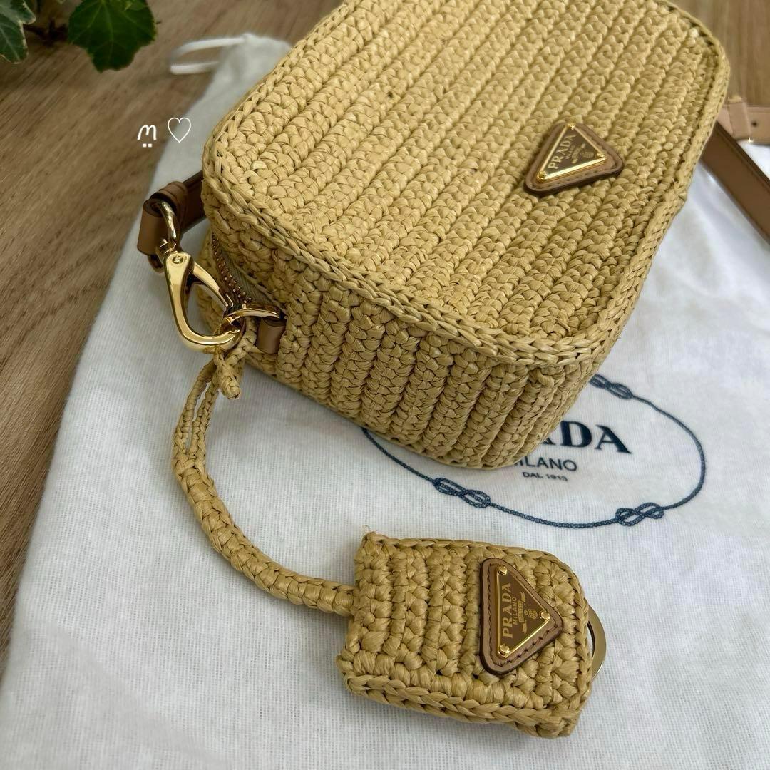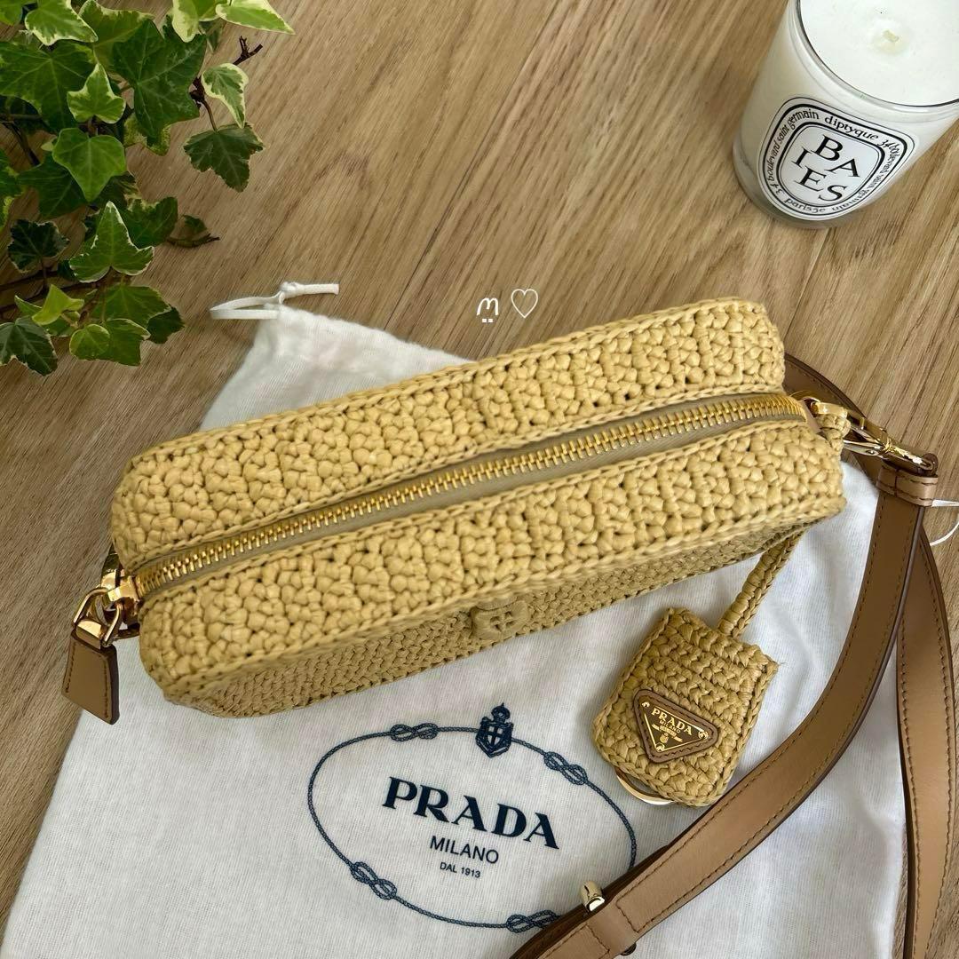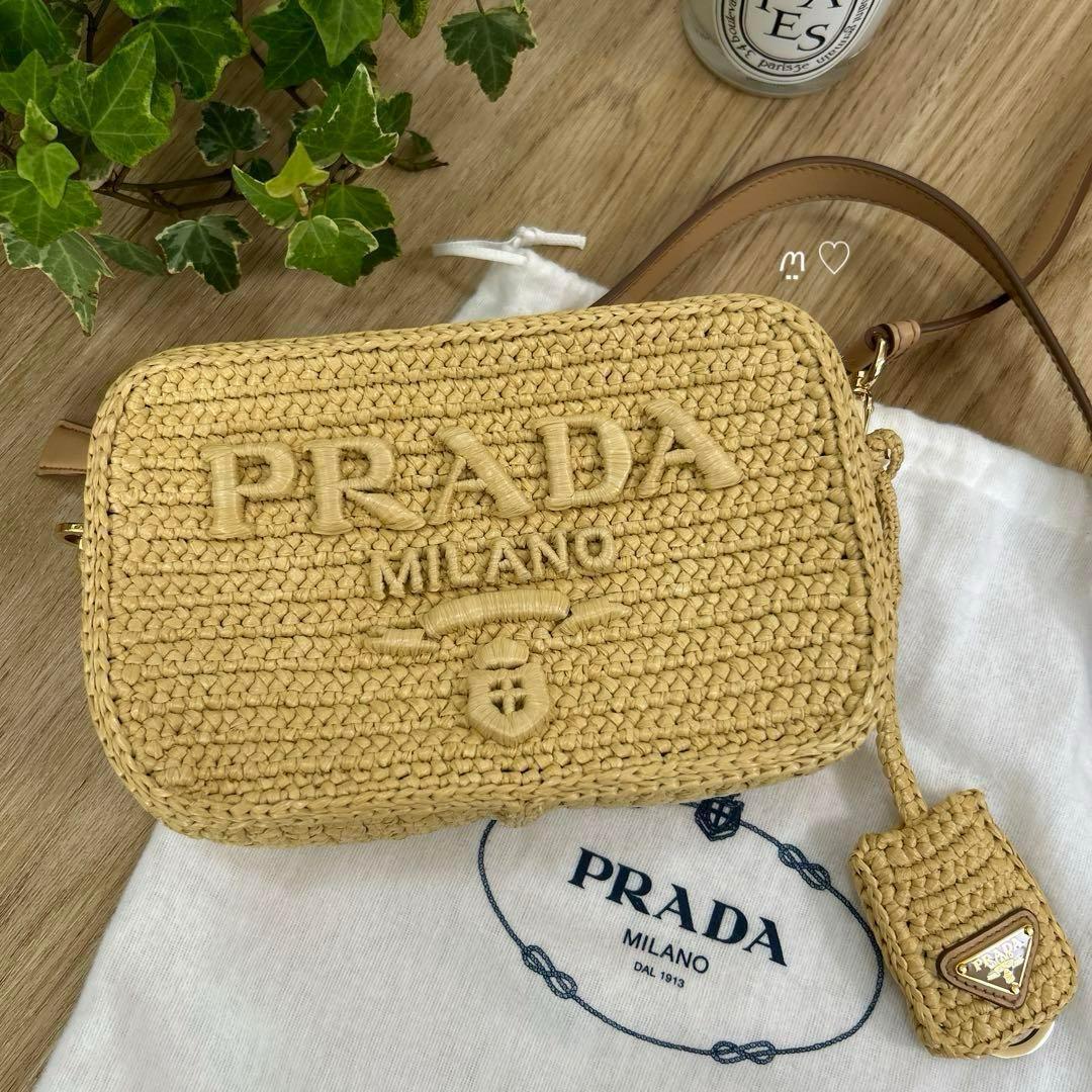 エンボスでPRADAロゴを表現した軽やかなラフィアショルダーバッグ。