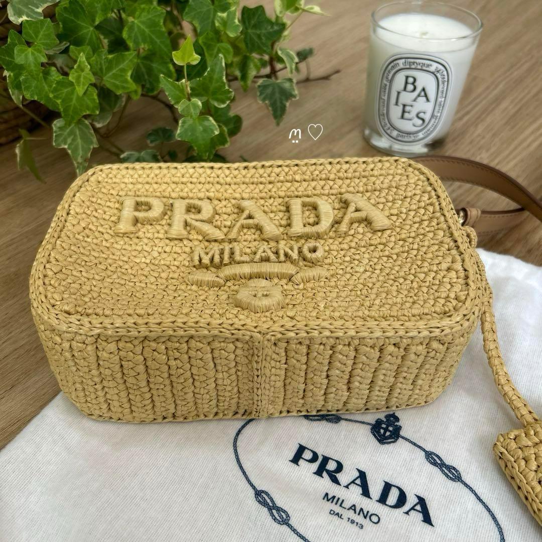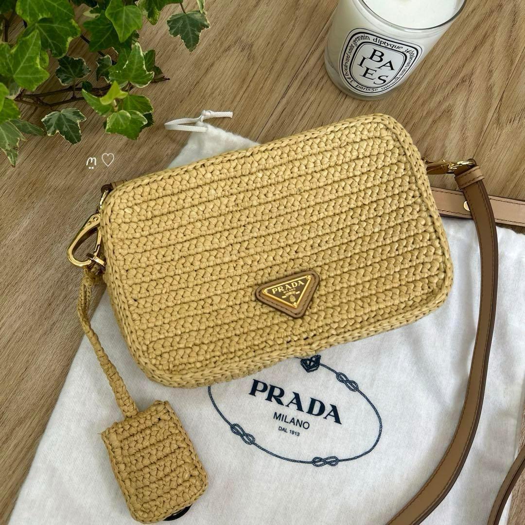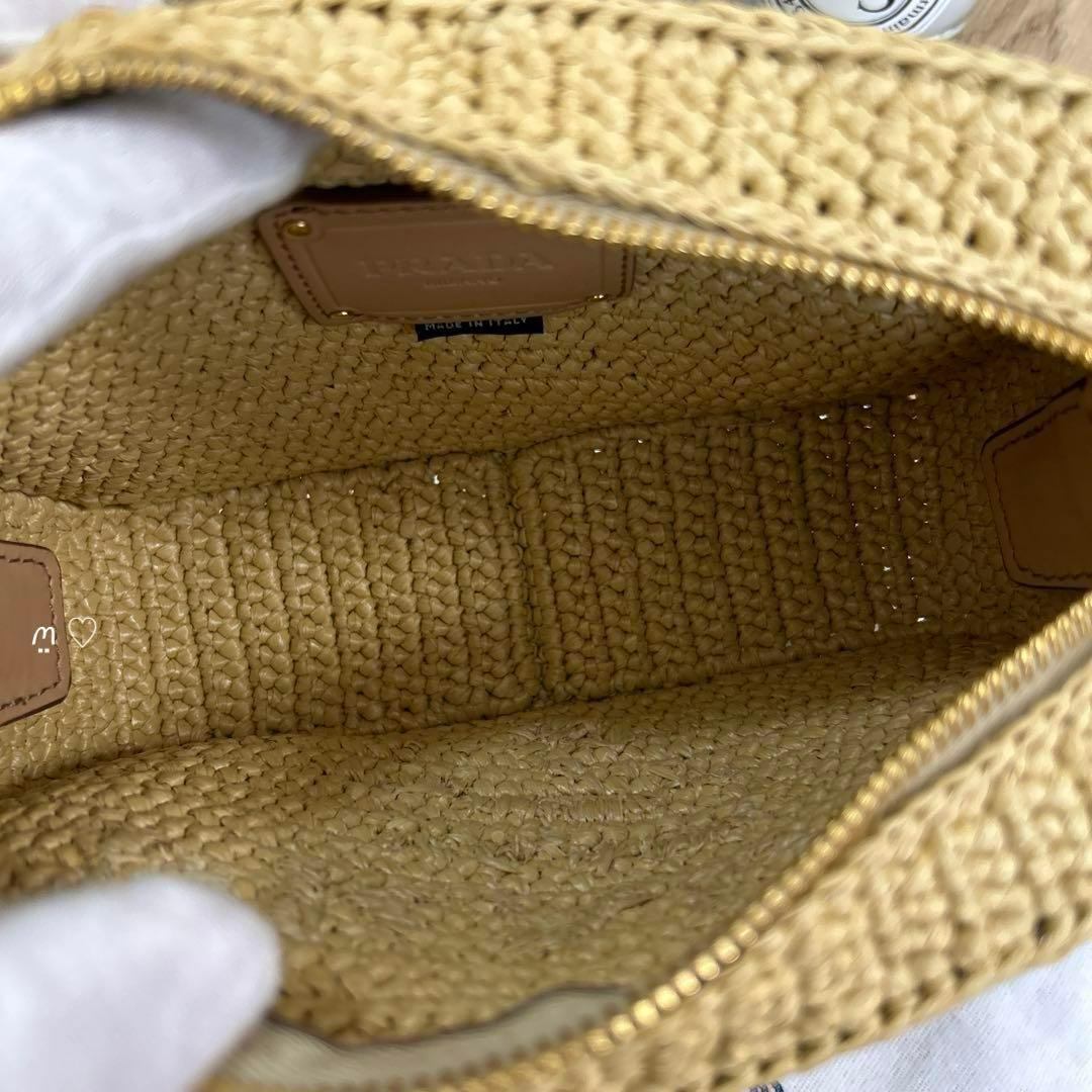 エンボスでPRADAロゴを表現した軽やかなラフィアショルダーバッグ。