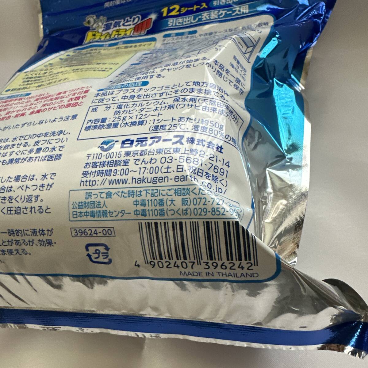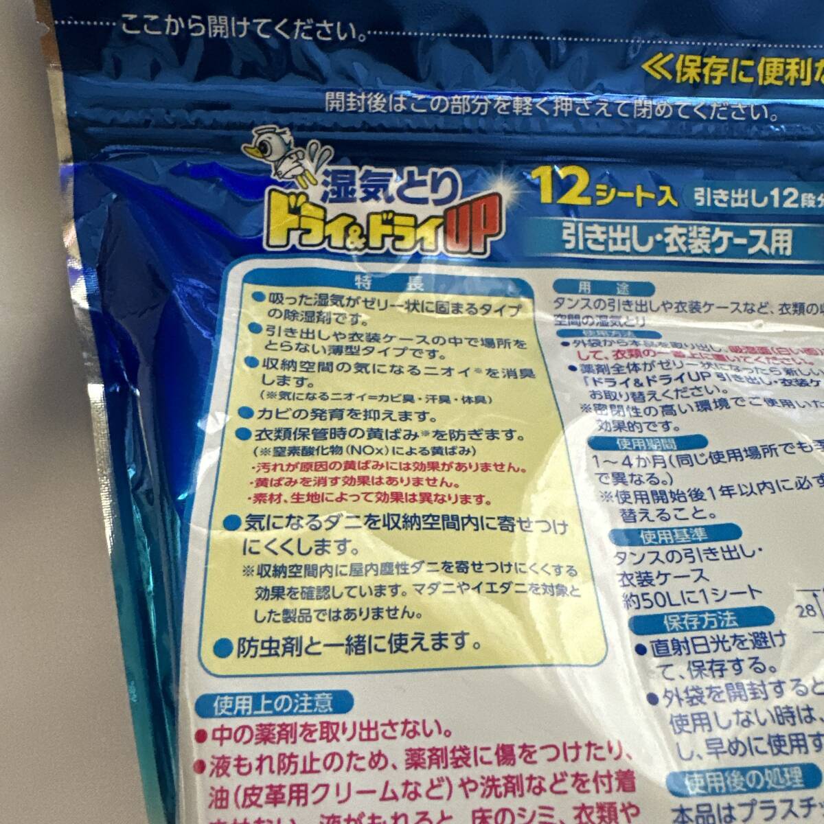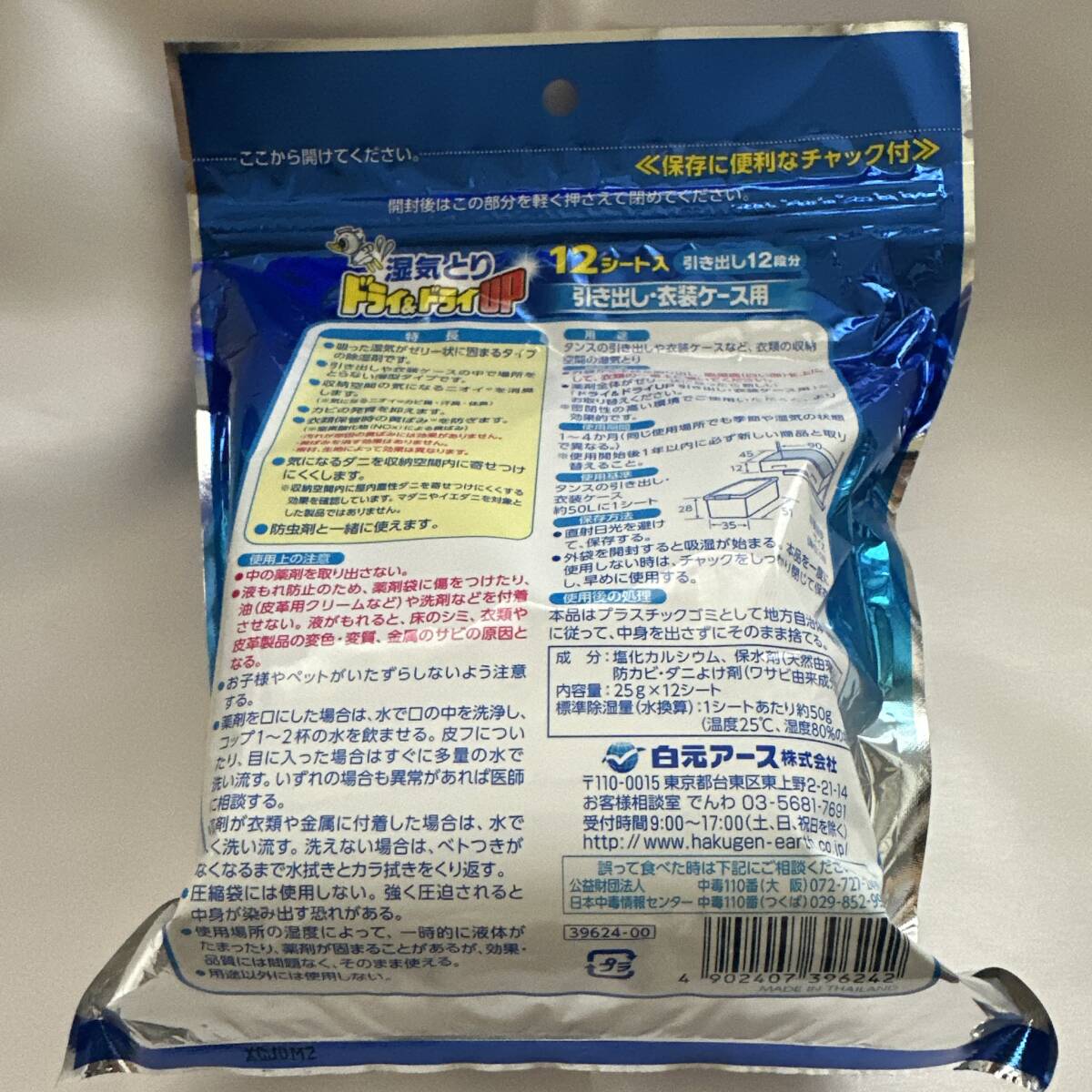 湿気とり ドライ&ドライUP 12シート 引き出し・衣装ケース用 白元アース 湿気を吸収し、カビやダニから守る12シートの除湿剤。 定形外郵便でお送りする予定です。 よろしくお願いいたします。
