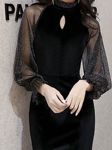ドレス ワンピース マーメイド 美ライン フレアカフス ワンピース 黒ワンピース ラウンドネック パーティードレス レディース おしゃれ ベルベット エレガント キャバ