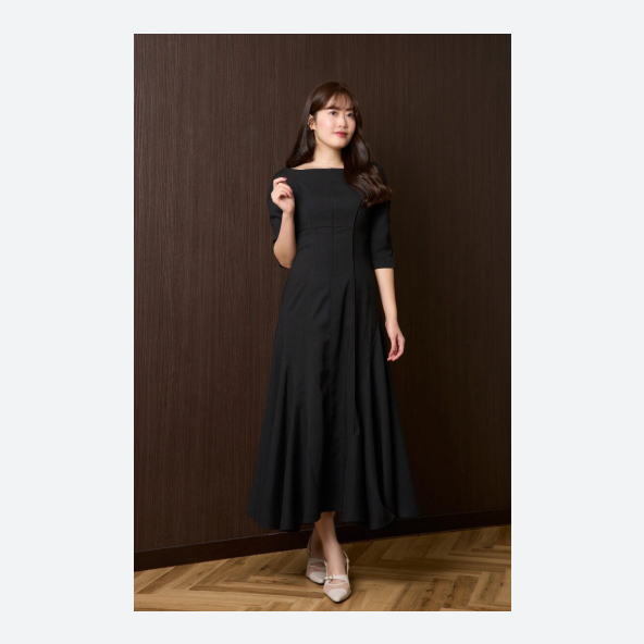 スカート部分の裾に配した斜めのラインからなる、大胆で印象的なフレアデザインは、エレガントな雰囲気を惹き立てるディティールポイントです。