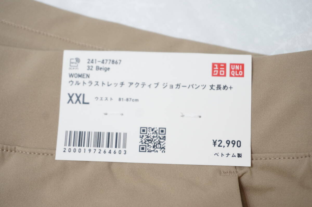 【1604.O】タグ付き! レディース ユニクロ ウルトラストレッチ アクティブ ジョガーパンツ 丈長め+ サイズ:XXL ベージュ