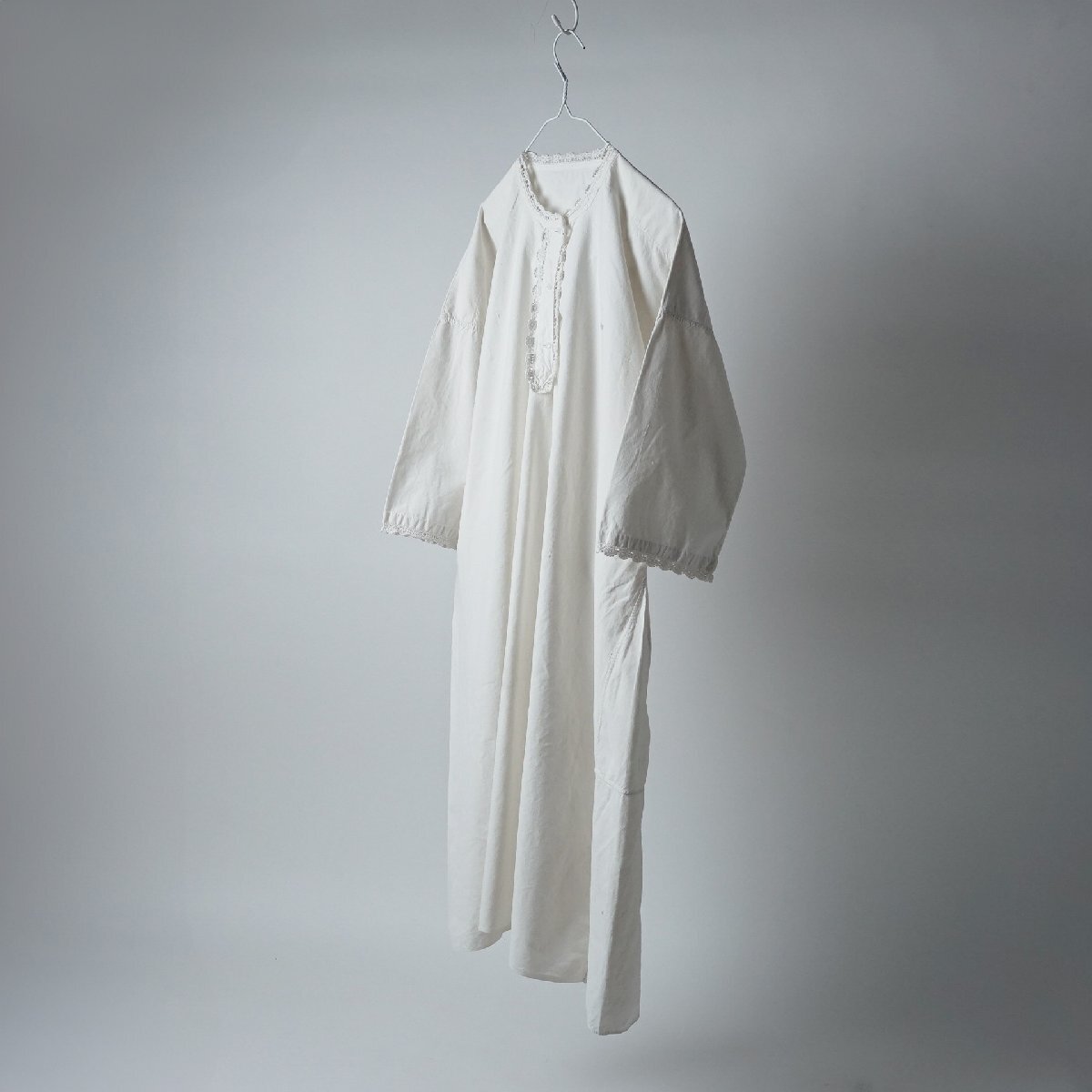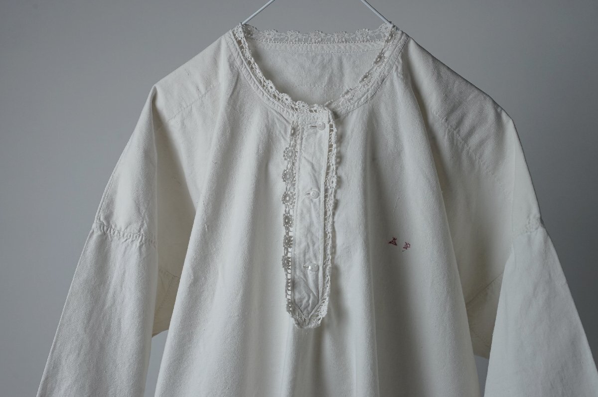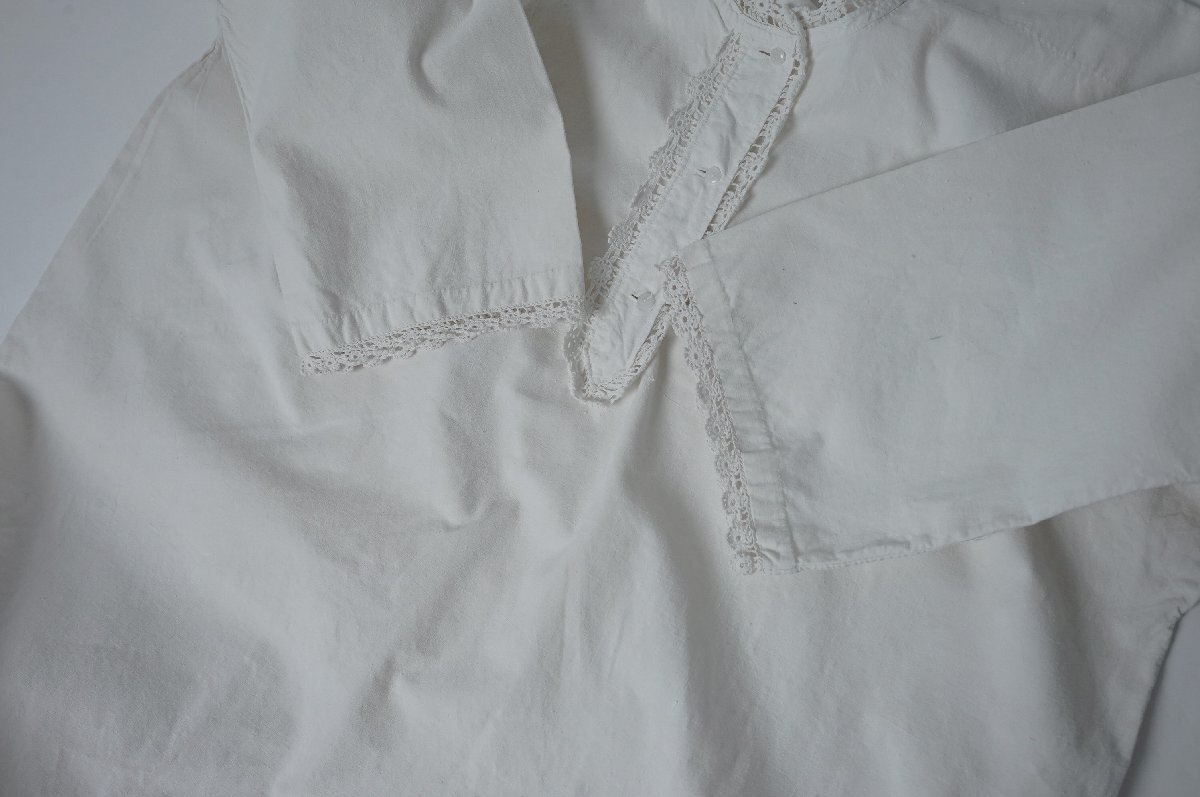 フランス アンティーク コットンリネン ワンピース スモックシャツ レース[E607]