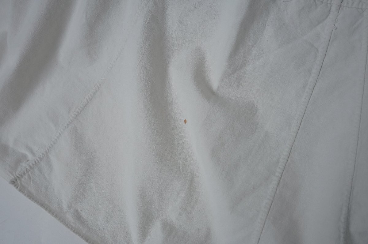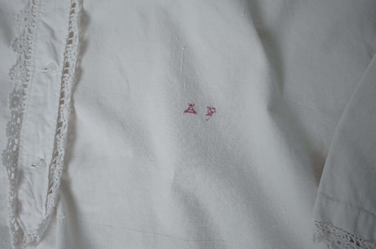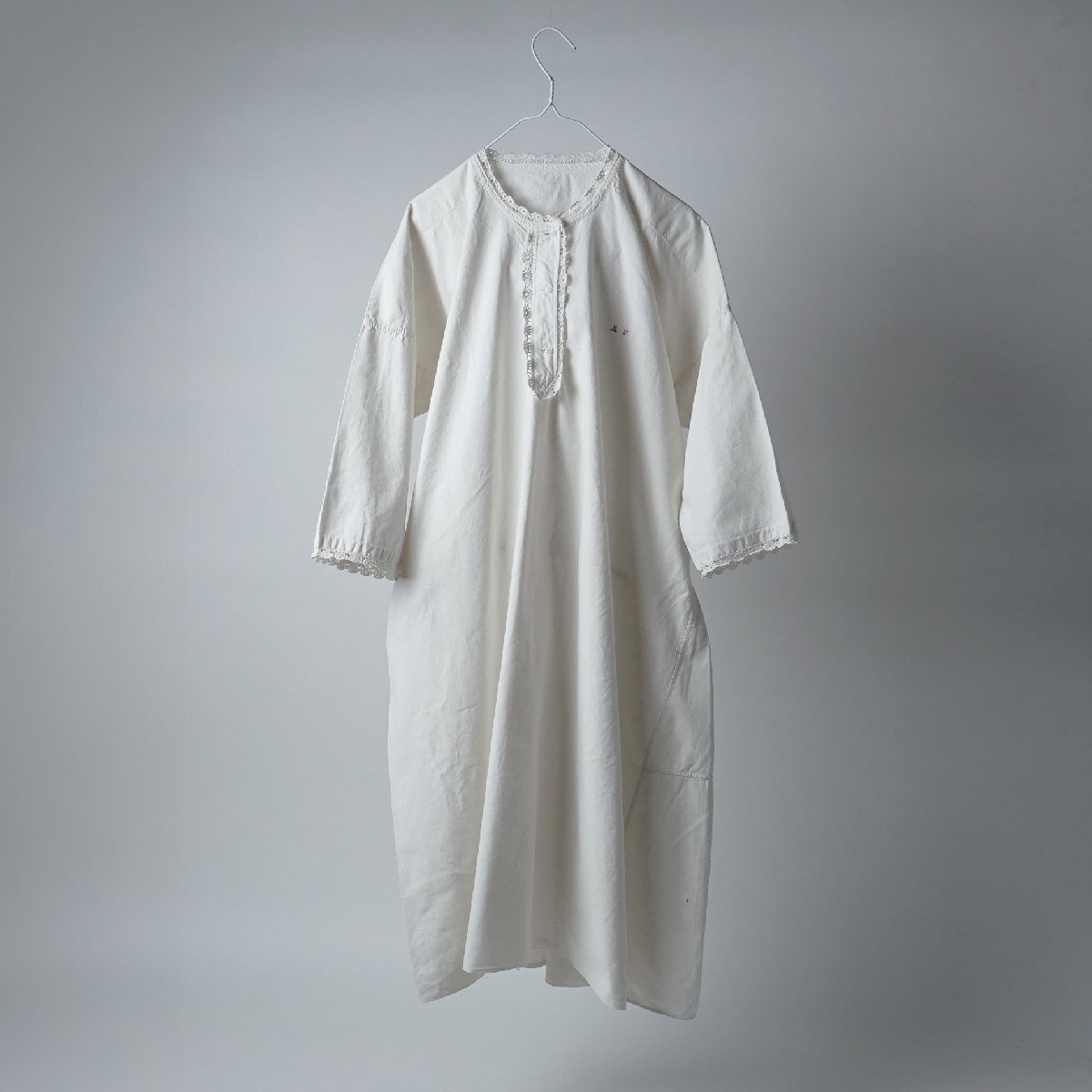 ○素材:フランス アンティーク ワンピースです。さらっとした手触りのコットンリネン素材です。前上部はボタンで閉じるデザインです。左胸に刺繍があります。フランス購入品です。