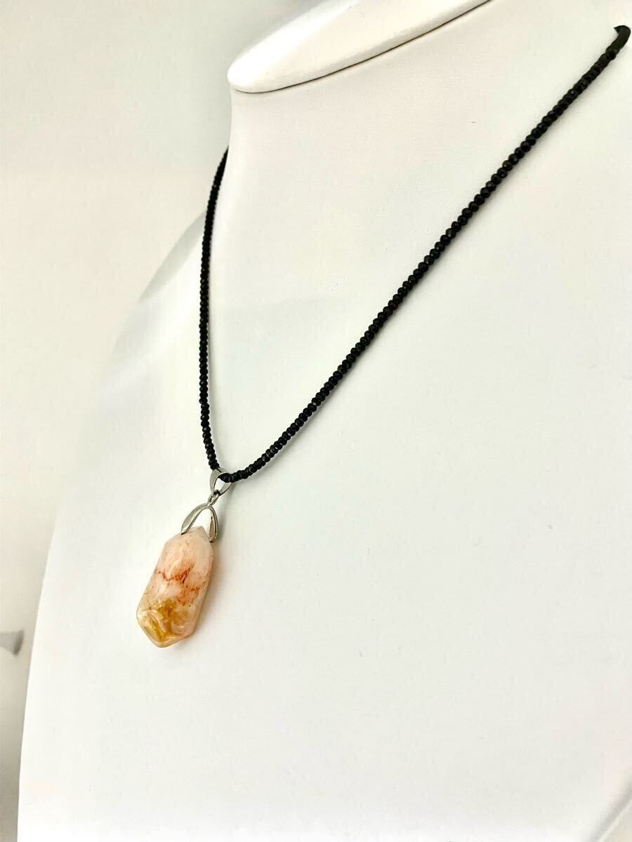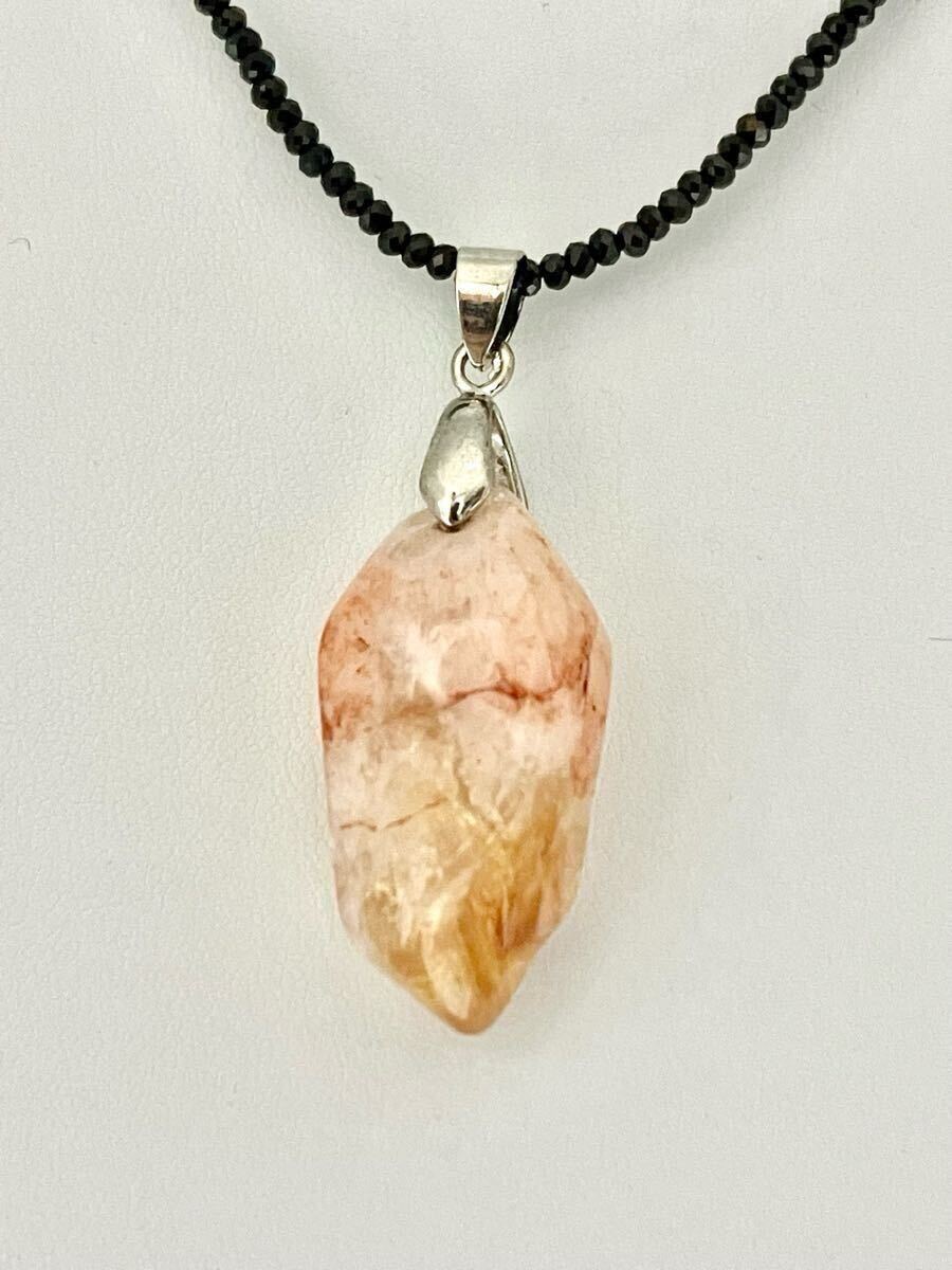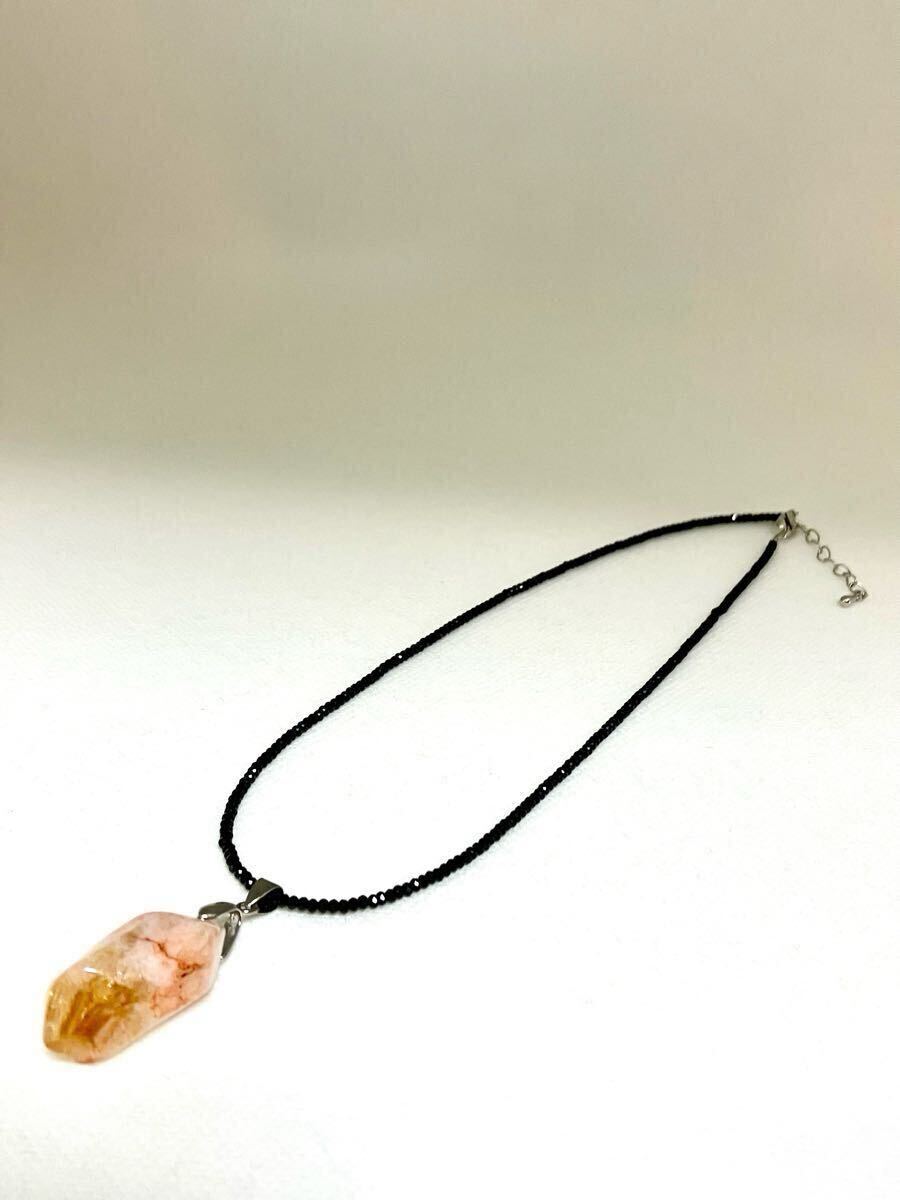 新品のとても綺麗な個性のあるシトリントパーズのペンダントトップをブラックスピネルに通したネックレスです。