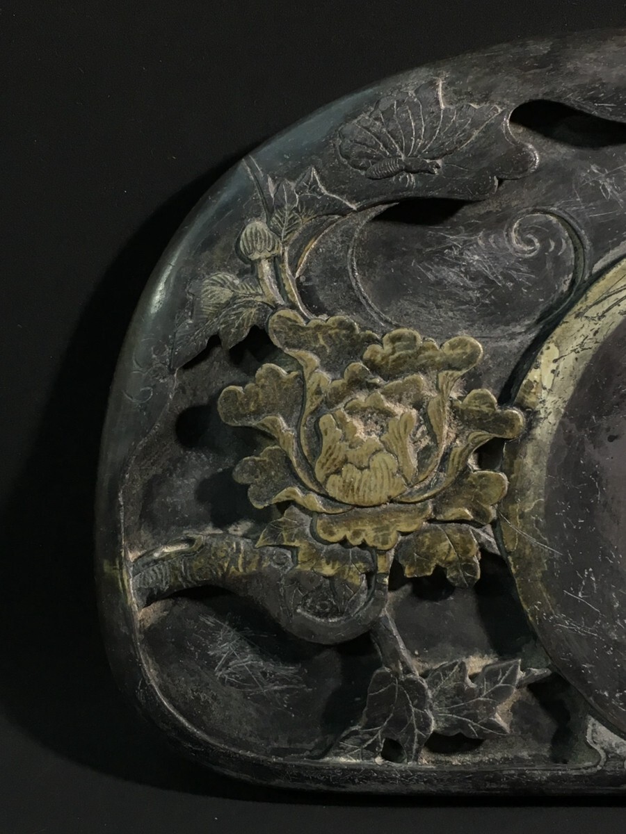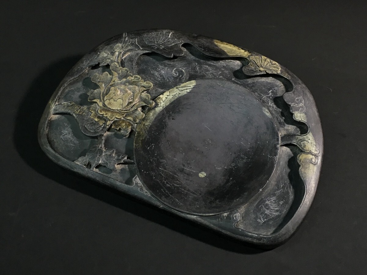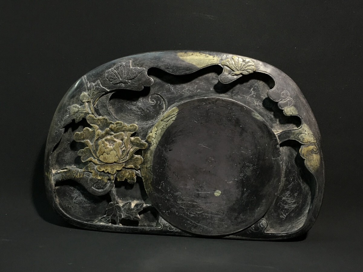 清代 端石浮彫 花開富貴文房端渓硯 石道人銘【仁】手彫り 文房具 書道具 中国古硯 蔵出 骨董
