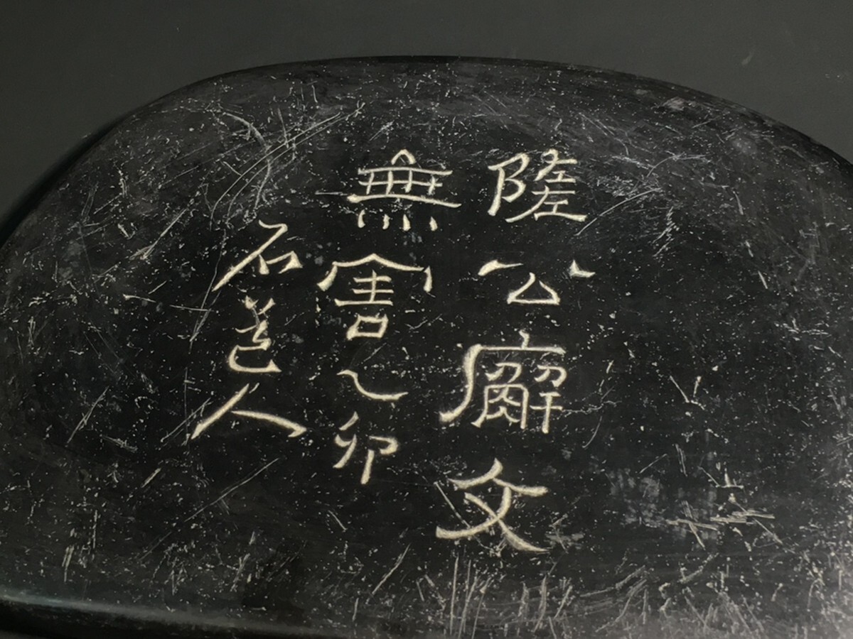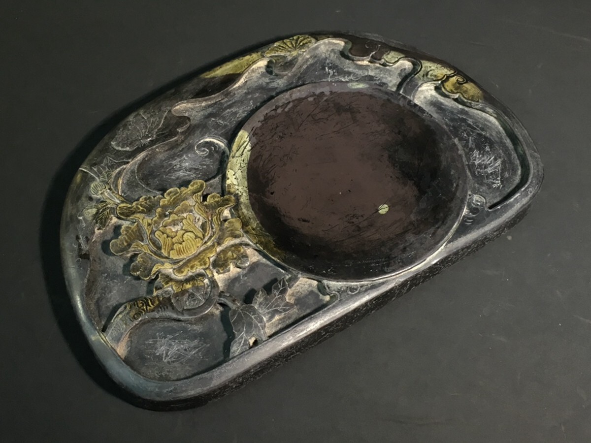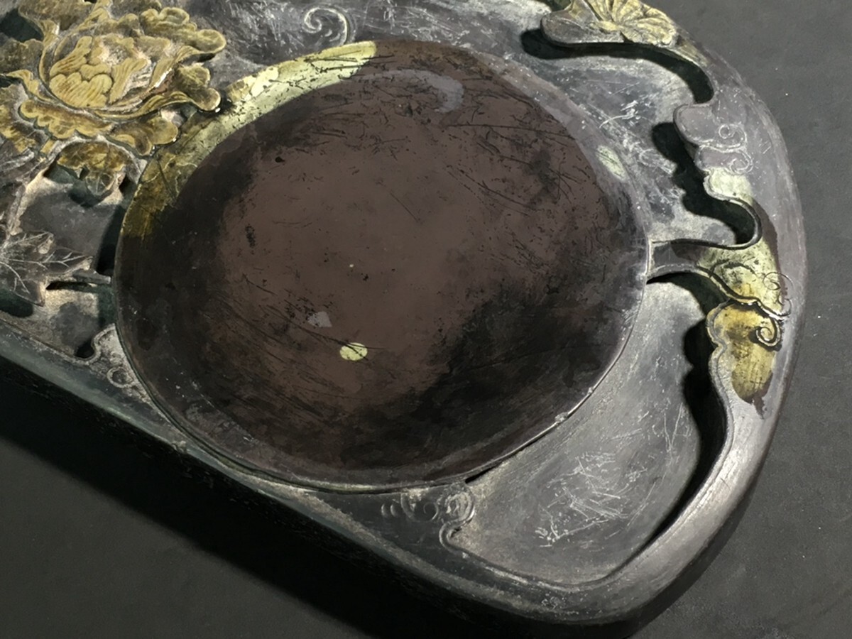 清代 端石浮彫 花開富貴文房端渓硯 石道人銘【仁】手彫り 文房具 書道具 中国古硯 蔵出 骨董