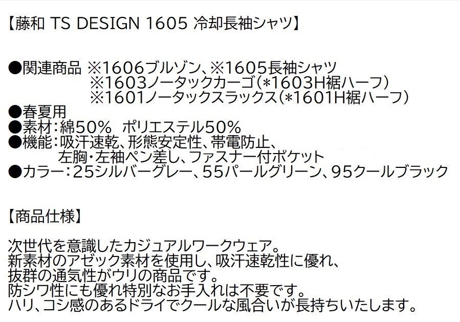 *同じシリーズ、春夏対応で ≪1606長袖ブルゾン、1605長袖シャツ、1601ノータックスラックス、1603ノータックカーゴパンツ、1601Hノータックスラックス裾ハーフ、1603Hノータックカーゴパンツ裾ハーフ≫ が、在庫ある分については出品されています