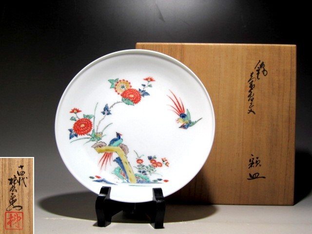 ○商品説明○ 十四代酒井田柿右衛門造の錦菊鳥文額皿です。 濁手ならではの温もりがある大変美しい作品です。 ○酒井田柿右衛門(さかいだかきえもん)○ 良質の陶土が発見されたため現在の佐賀県西松浦郡有田町に移住した酒井田円西は、 息子である喜三右衛門とともに陶器や白磁、染付などの磁器を製作していたが、やが て17世紀前半に喜三右衛門は赤絵磁器の焼成に成功し、柿右衛門を名乗った。 初代は江戸時代、肥前国(佐賀県)有田の陶芸家代々その子孫(後継者)が襲名する名称。 中国の上絵付けの技法を学び、日本で初めて赤絵の焼成に成功、国内外に大きな影響を与えた。 作品は乳白色の素地に細い線で雲竜,鳳凰,松竹梅などの文様を描き気品高い。 ○サ イ ズ○ 直径19.5cm/高さ3.5cm(多少の誤差はお許しください) ○状 態○ 無疵である事は確認しておりますが、時代のスレ等ある場合があります。 写真で良くご覧頂き気になる個所が御座いましたらご質問下さい。 ○決済方法○ かんたん決済 ○発送方法○ 佐川急便元払い 全国一律1,000円 北海道1,500円 沖縄2,000円 離島2,500円 複数点ご落札頂きましても、一点分の送料で結構です。 | ||