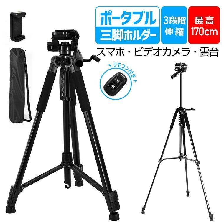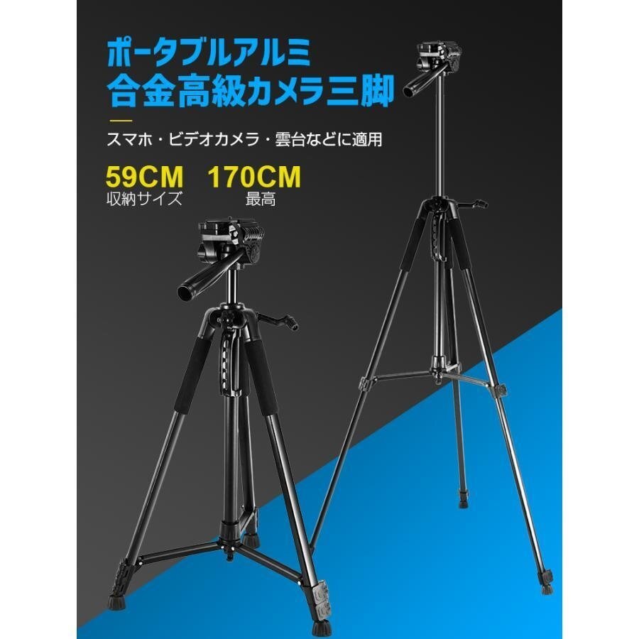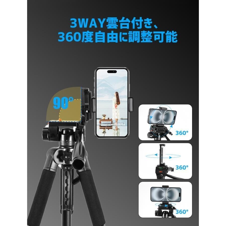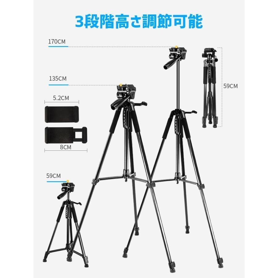 カメラ三脚 スマホ 三脚 ビデオ iPhone 3WAY雲台 170cm 3段階伸縮 360°回転 スマホホルダー 自撮り棒 Android カメラスタンド 収納袋付