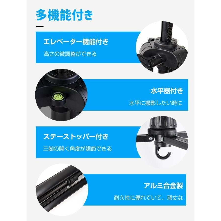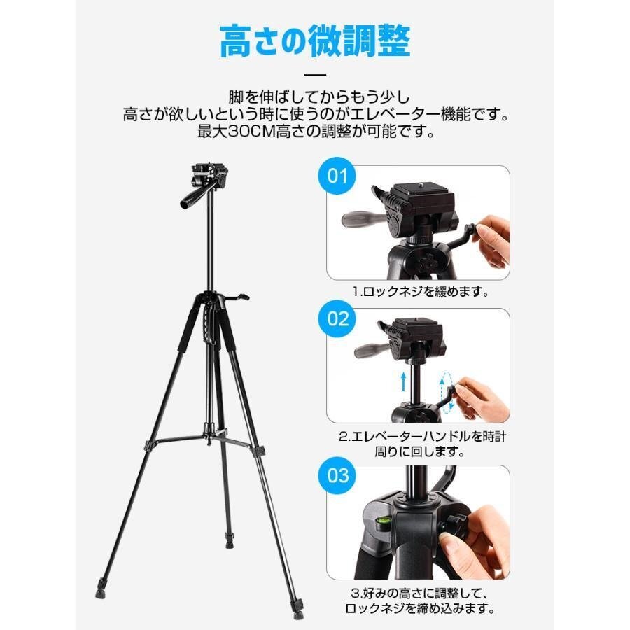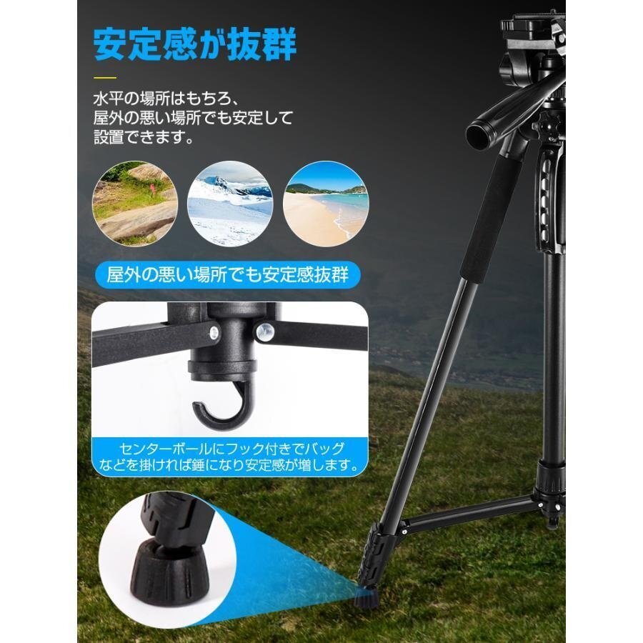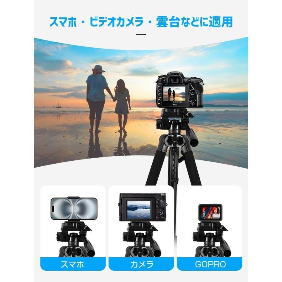 カメラ三脚 スマホ 三脚 ビデオ iPhone 3WAY雲台 170cm 3段階伸縮 360°回転 スマホホルダー 自撮り棒 Android カメラスタンド 収納袋付