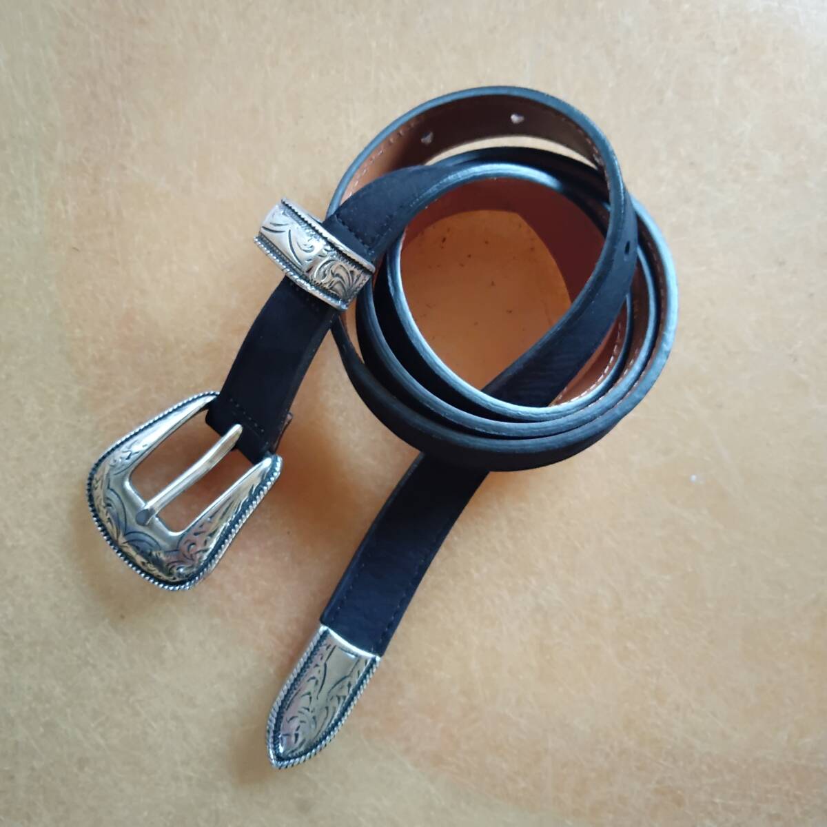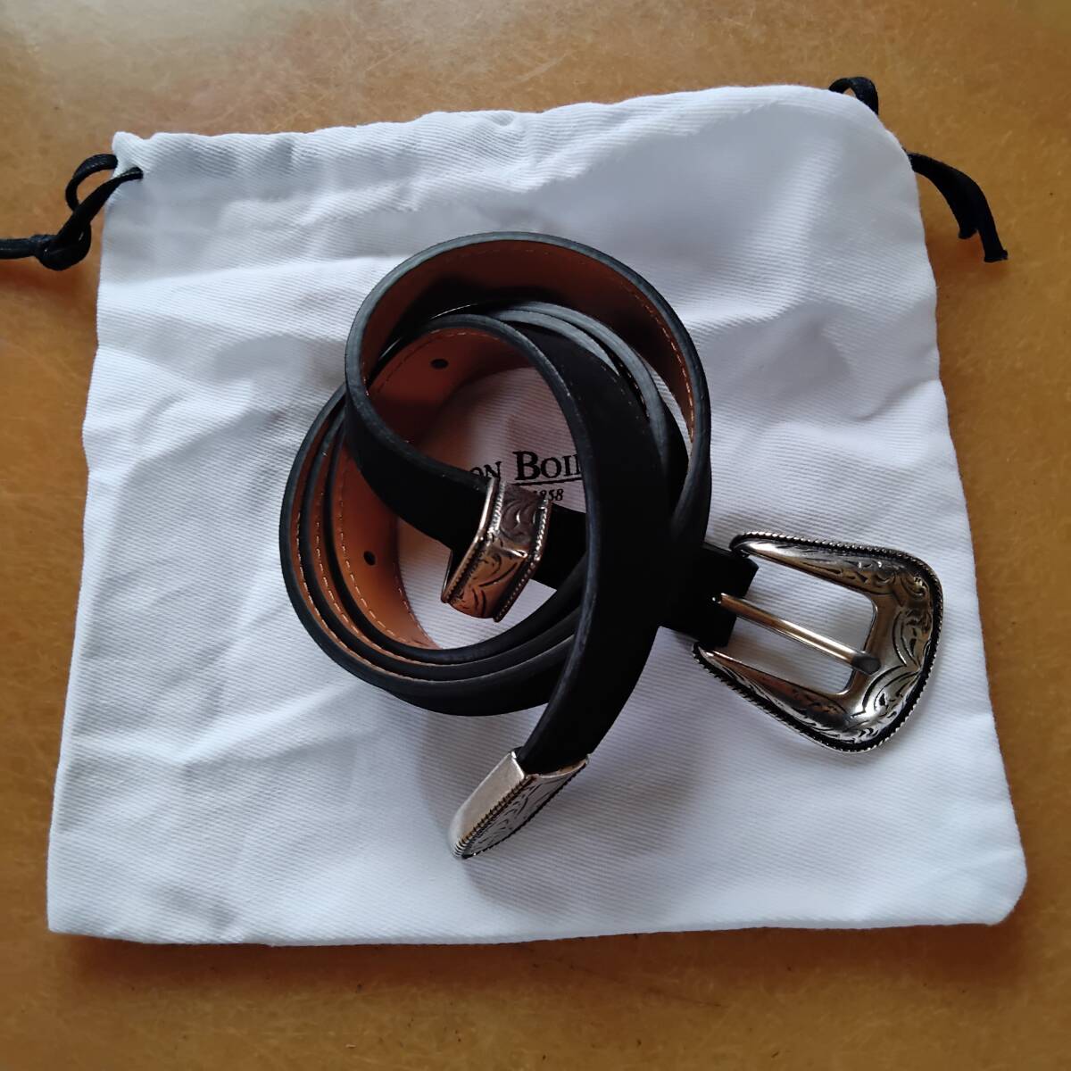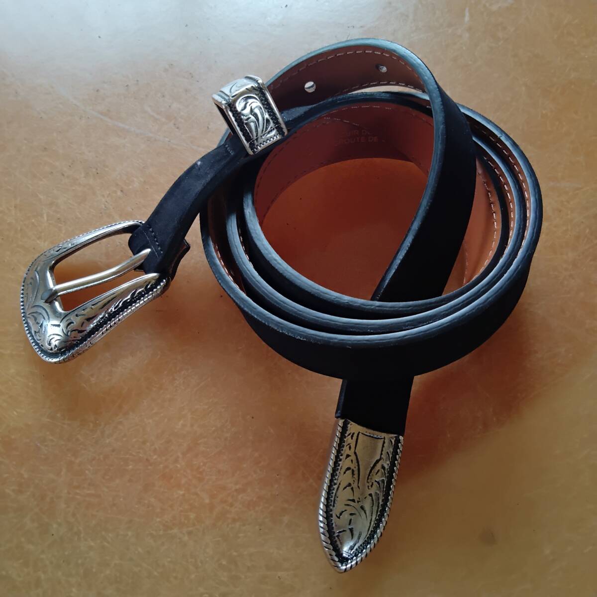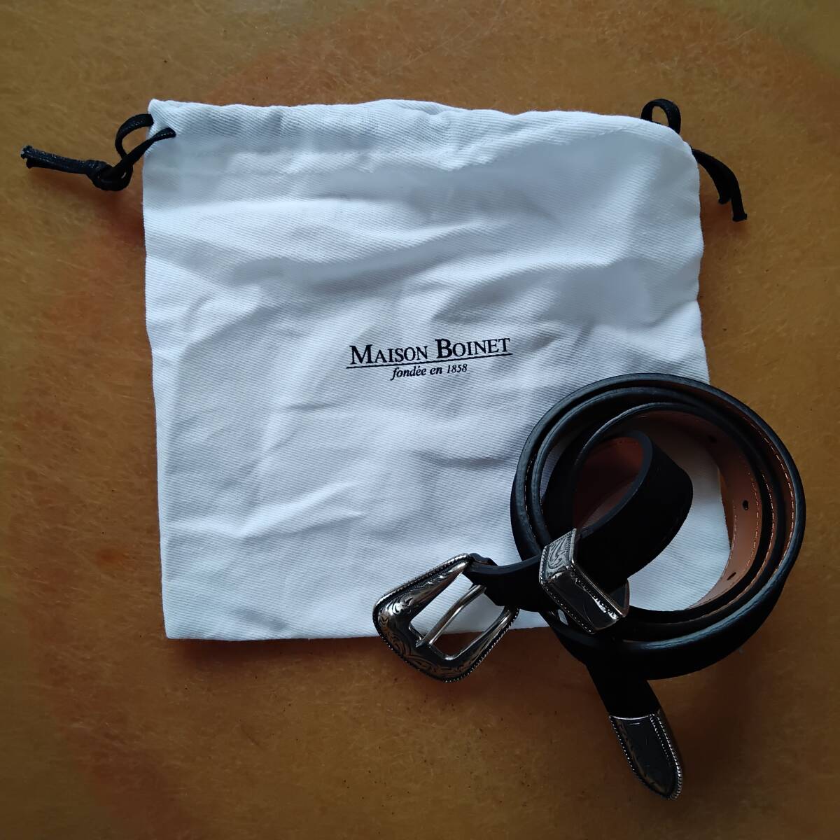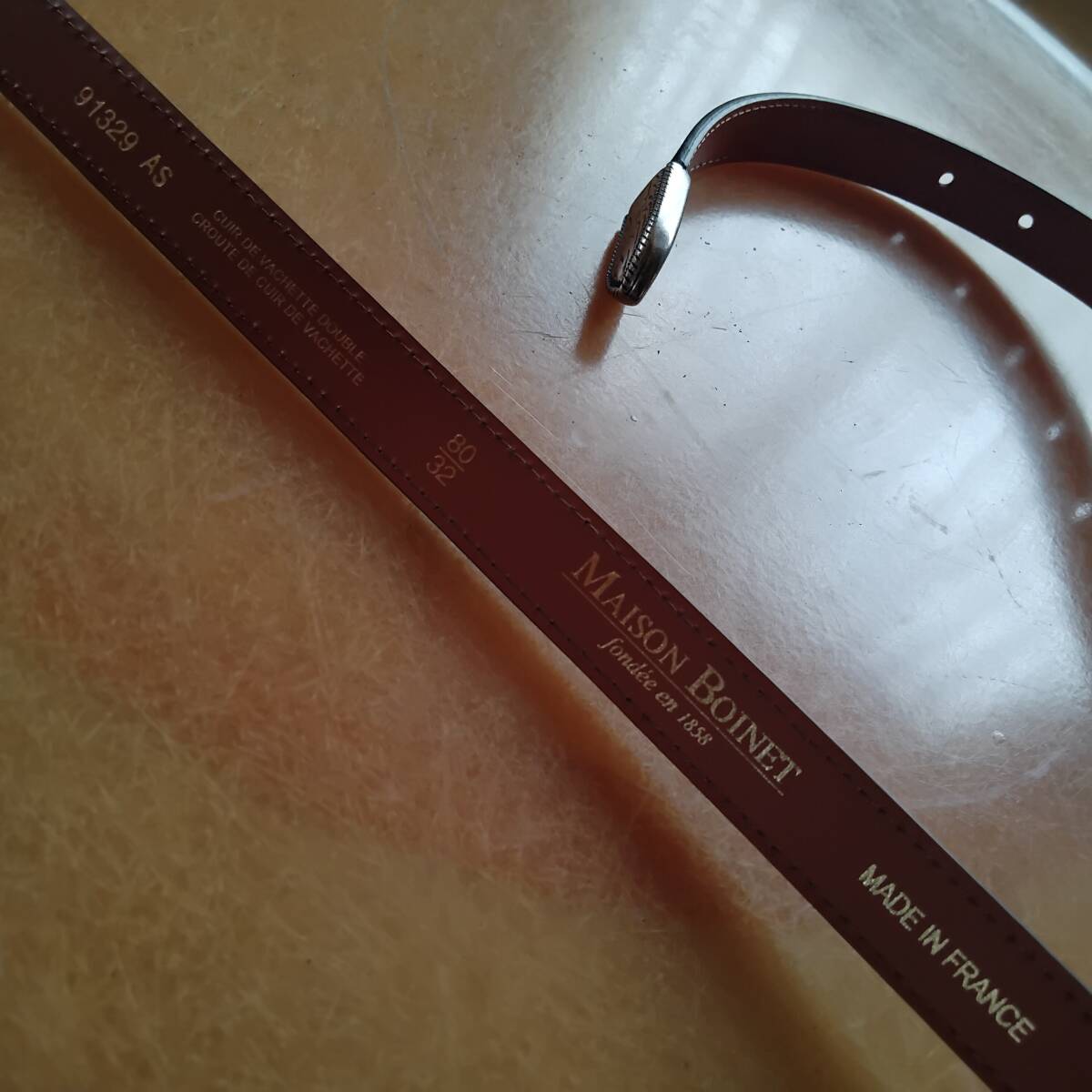 未使用「 MAISON BOINET」MADE IN FRANCE スエードウエスタンナローベルト ヌバックブラウン サイズ80/32 シルバーカラードバックル 細ベルトになります。