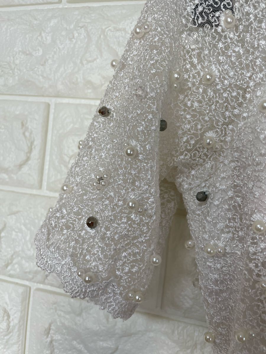 ビーズとパールの刺繍が施されたエレガントなホワイトAラインパーティードレス。