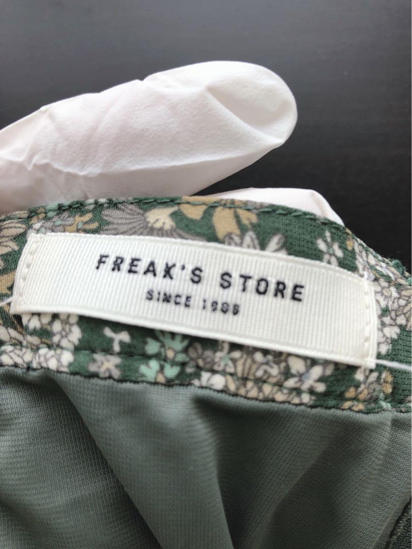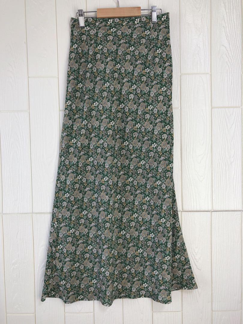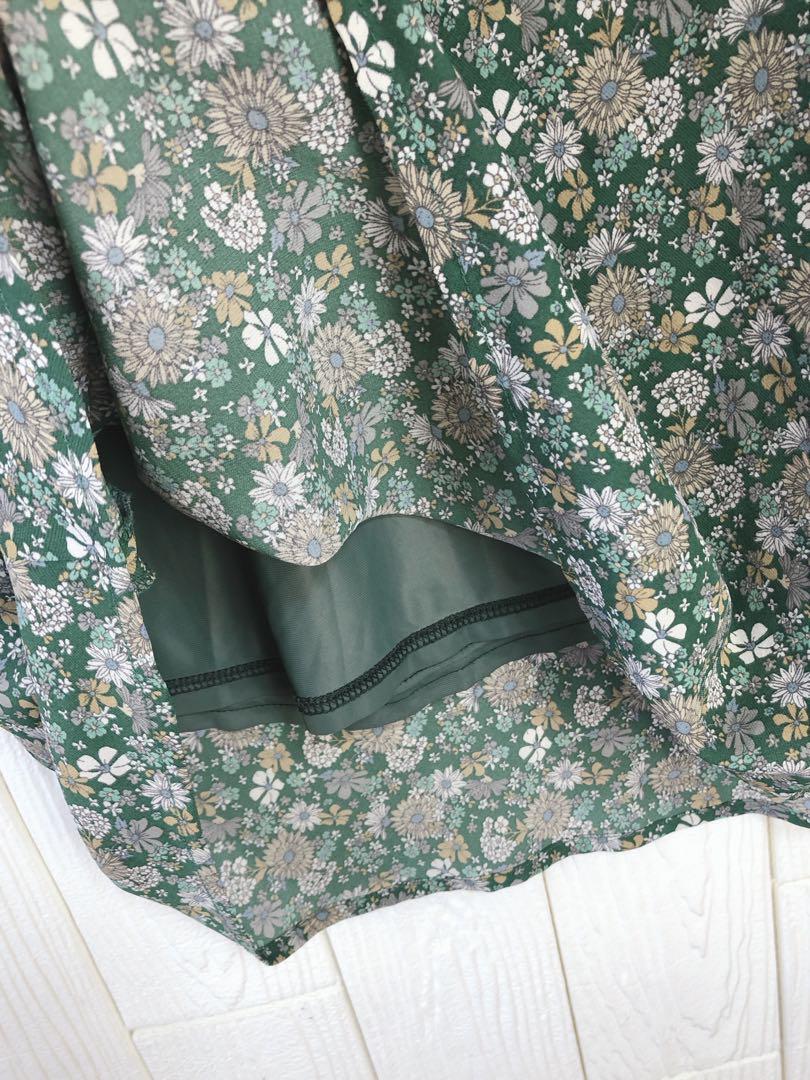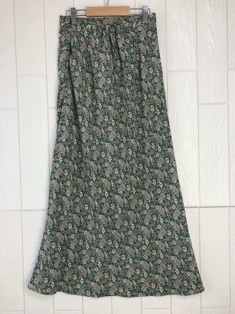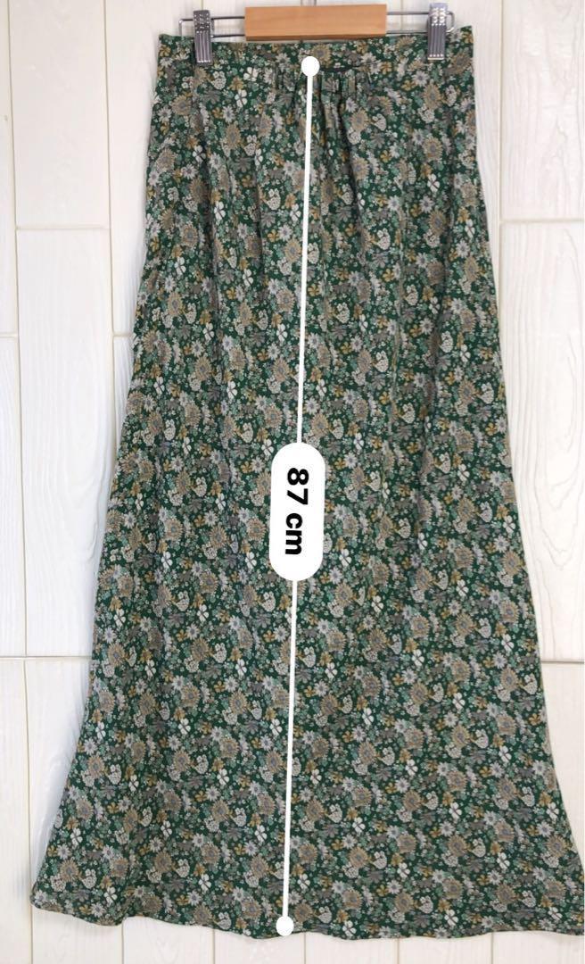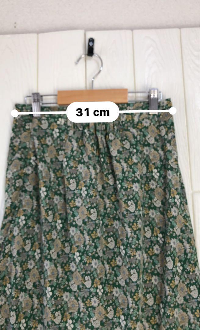 グリーン系の花柄が特徴のフレアスカート、ウエスト64cm、丈87cm。