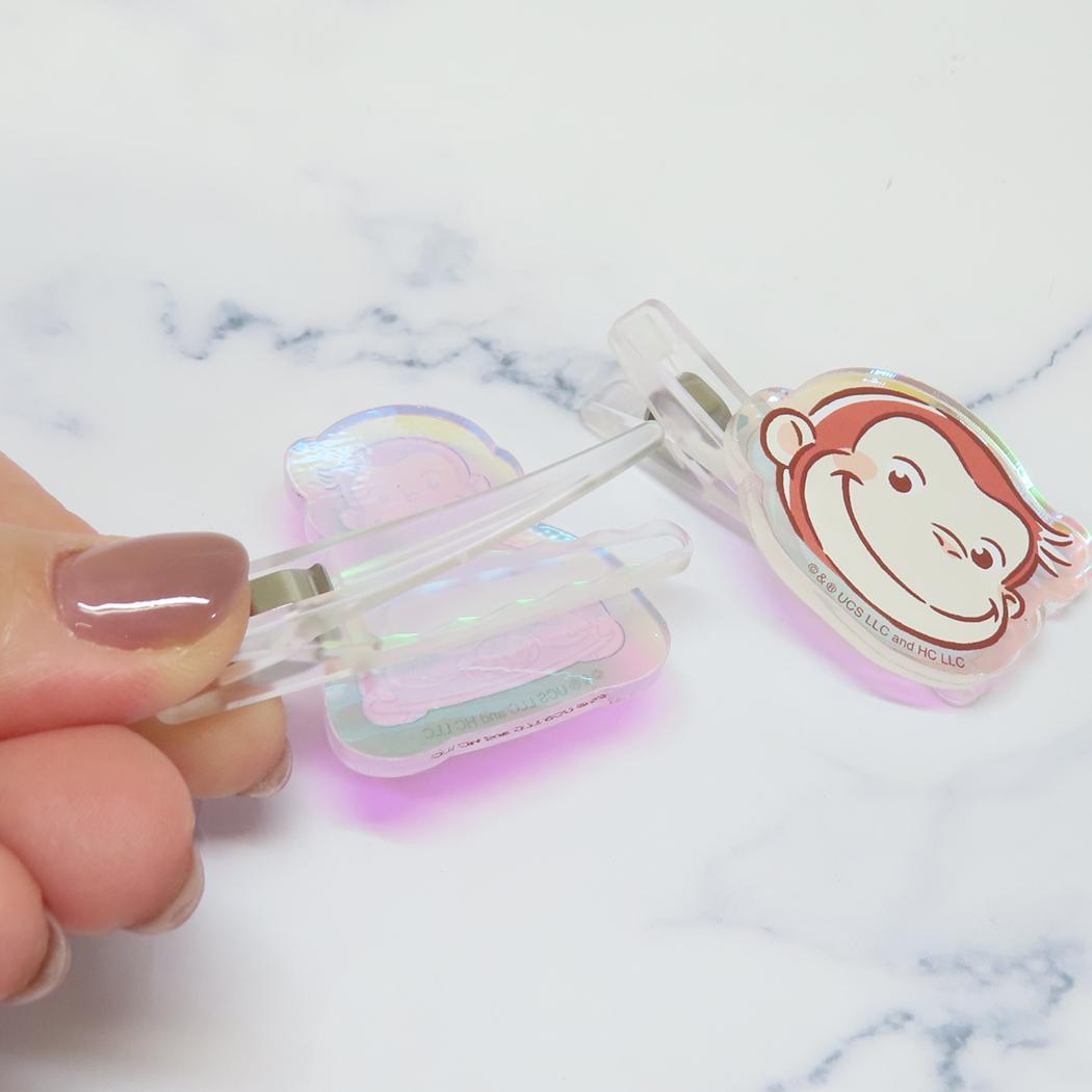左右に留められる可愛いヘアークリップ 世界中で愛されている人気絵本[キュリアスジョージ/おさるのジョージ]グッズにまたまた可愛いnewアイテム登場こちらはかわいい[オーロラアクリルヘアクリップ2個セット]左右どちらにも留められるのでメイクや食事、洗顔、デスクワークに使えて便利かわいい雑貨いろいろあるのでお気に入りを揃えてくださいアクリルサイズ:約40x40mm(2個入り)素材:アクリル/ステンレス