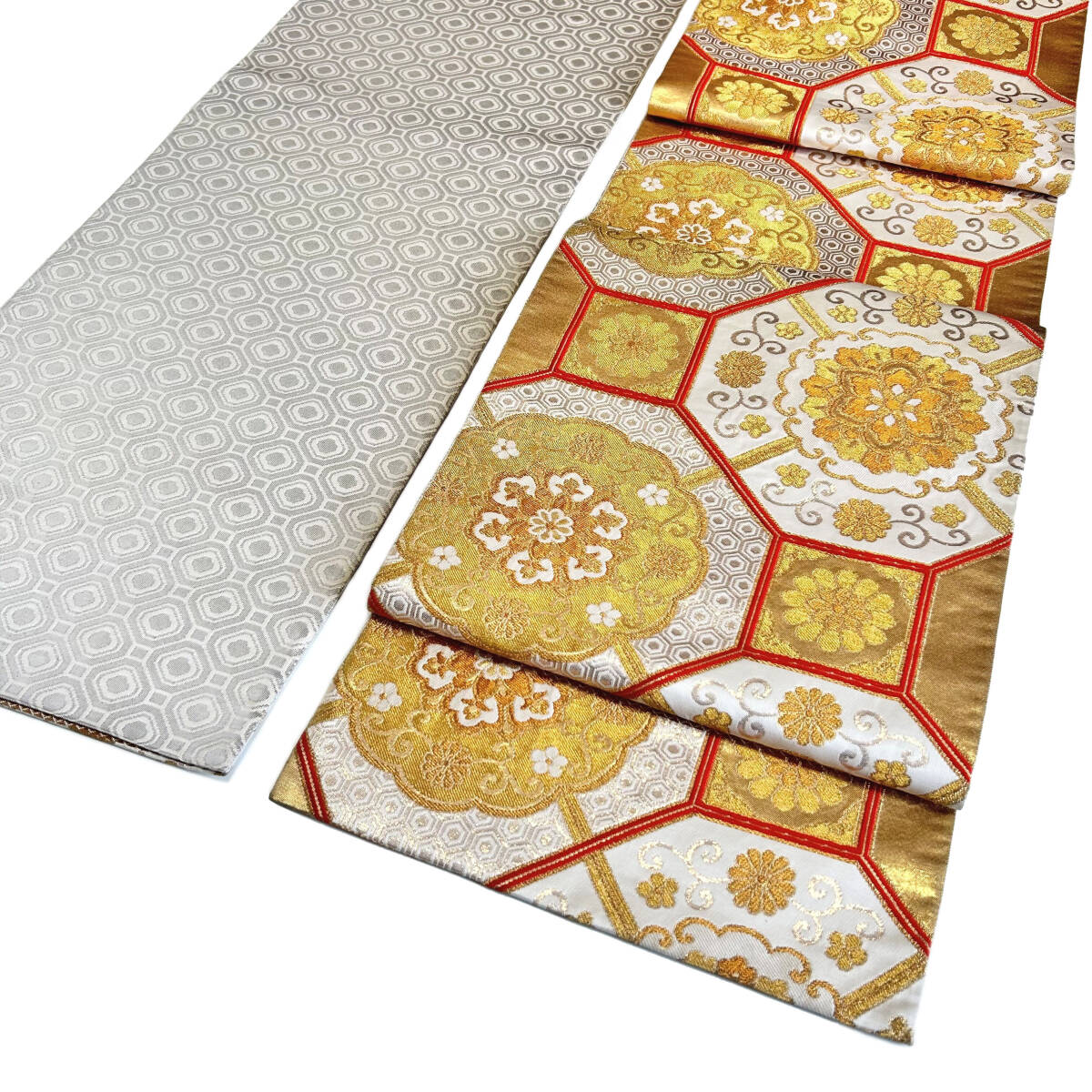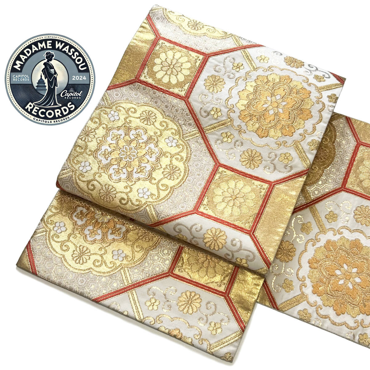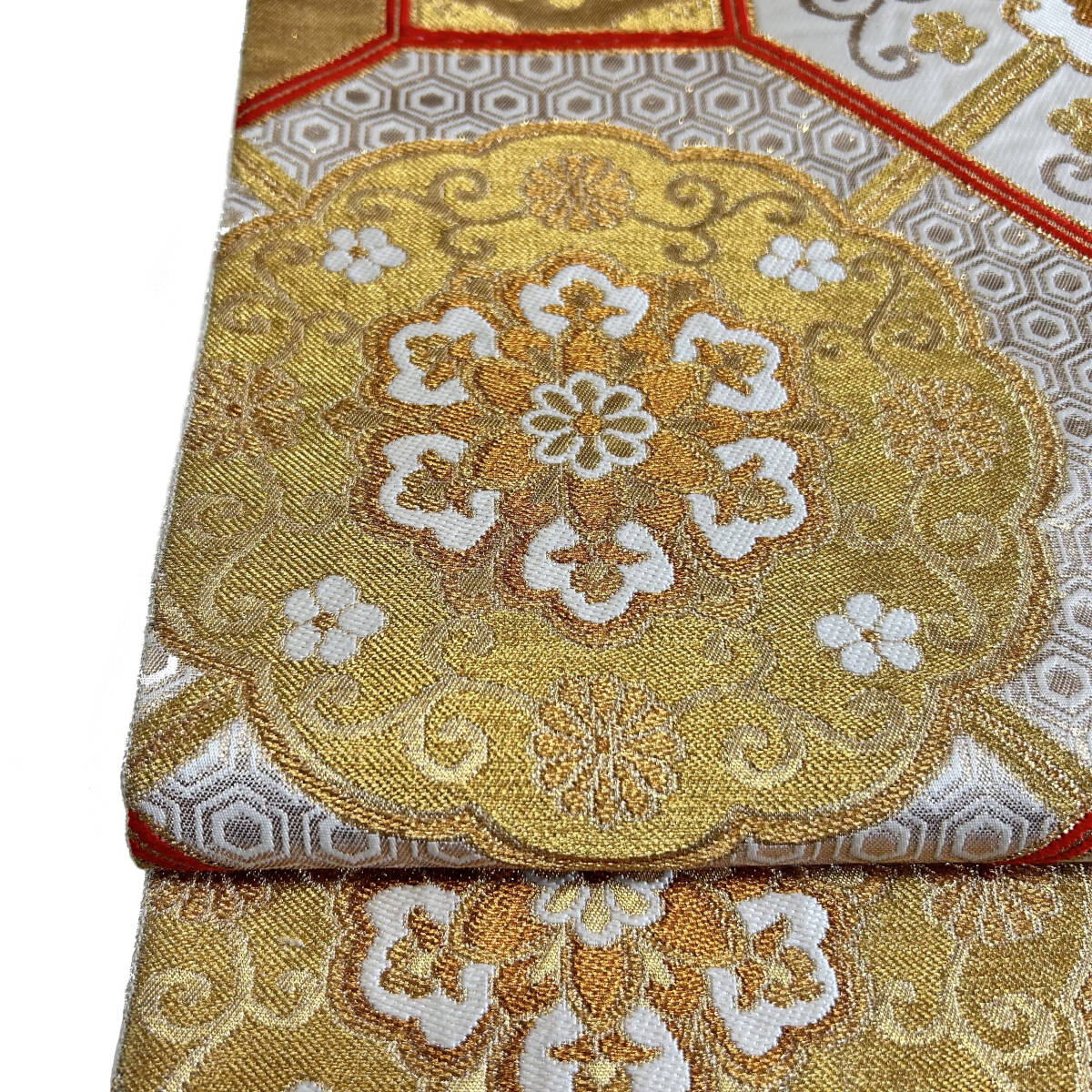 綺麗なオフホワイト地に、金銀糸を使用し名物裂文様・蜀江柄が織り出されたお品です。