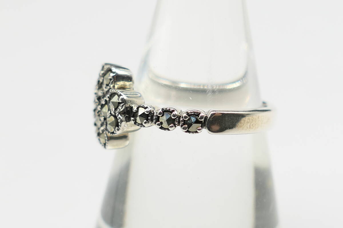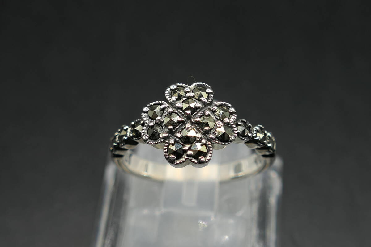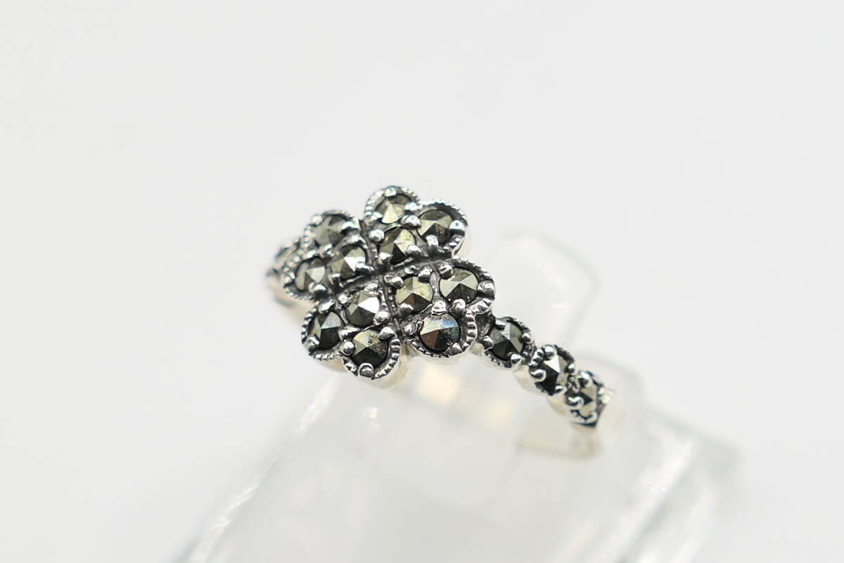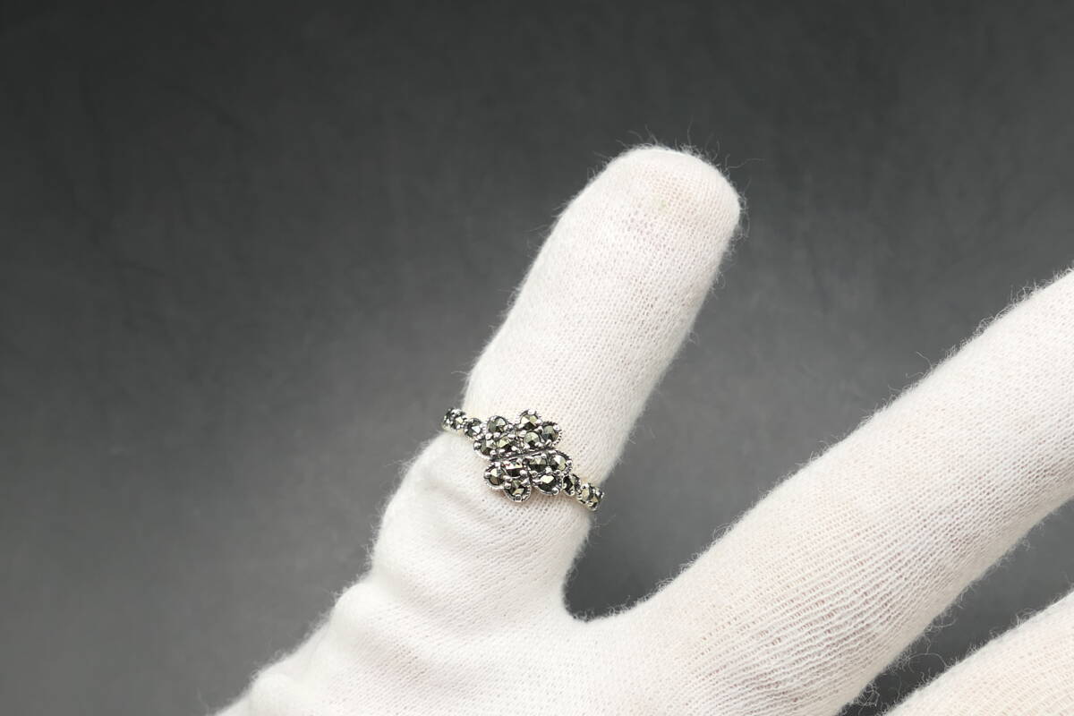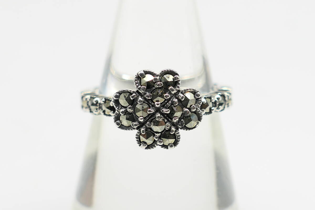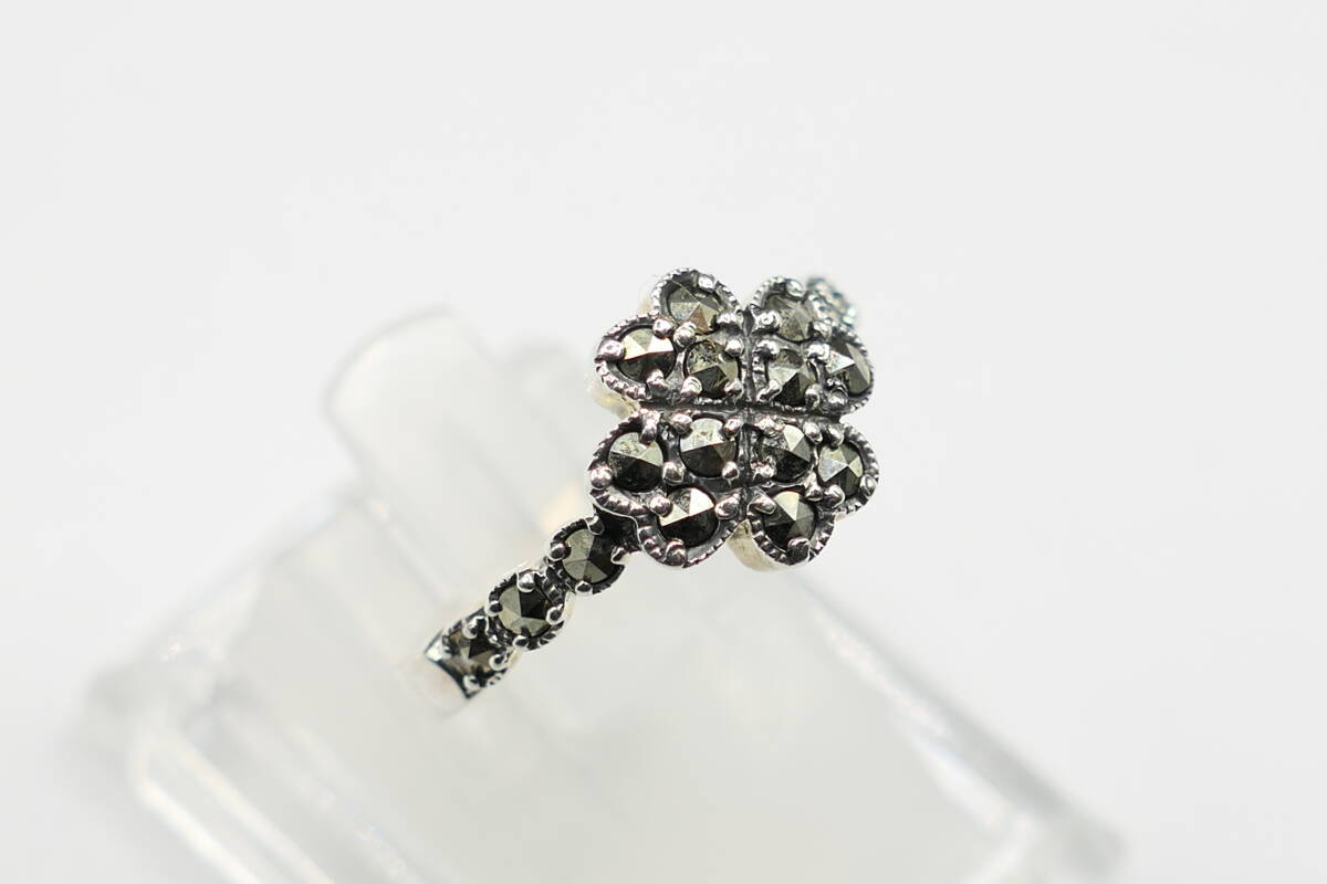 中央に幸運の象徴である四葉のクローバーをセットし、周りにはきらきら光るマーカサイトをセットしました。