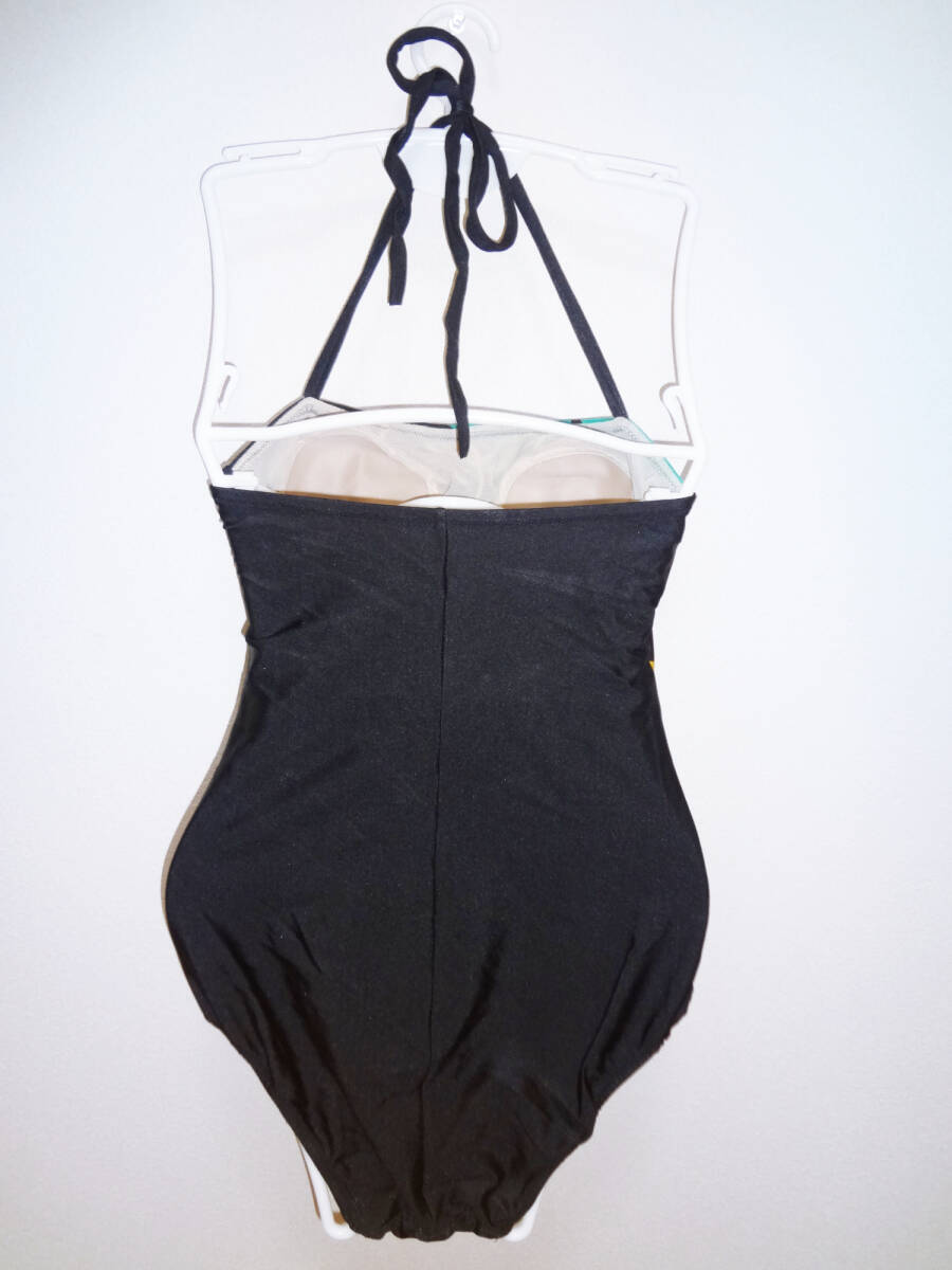 【おすすめ品・つるつる素材】黒地にカラフルな花柄模様・レトロワンピース水着・9Mサイズ | |||