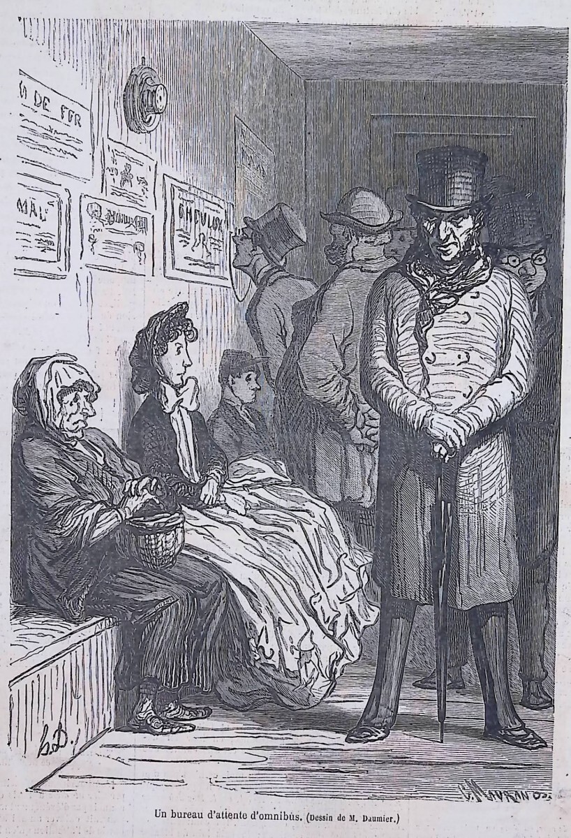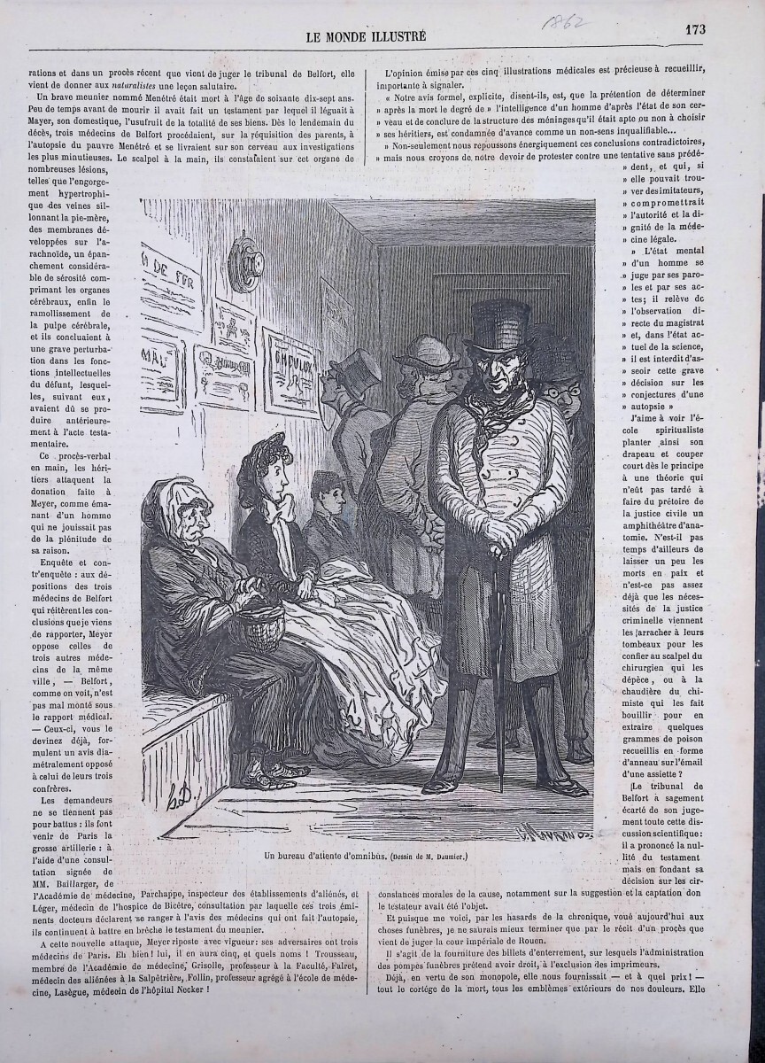 Honore Daumier の作品は、1960年代にパリで刊行される新聞に掲載されるようになります。これは、当時の新聞の一葉です。オリジナルの木口木版画です。 新聞紙のサイズは26cmx36.7cmです。その半分くらいの部分がドーミエの版画です。少し古色が出ていますが、状態は良いと思います。版上にサインがあります。ドーミエの版画のうち、新聞に掲載されたものは、殆ど残っていません。非常に珍しいものです。