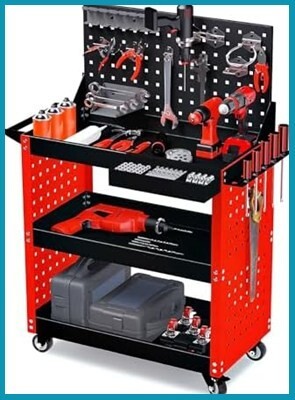 MIMIER ツールワゴン ツールカート 工具ワゴン 工具カート 3段 キャスター付 ドライバーホール メッシュパネル 側面プレート 耐荷重195KG 360度回転 ハンドル レッド フック付き DIY ガレージ 収納ボックス付