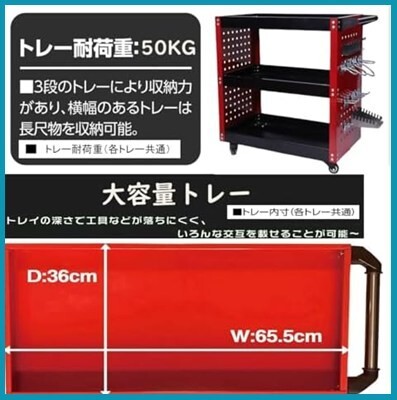 • 【耐久性・機能性】トレイ深さは、約5.8cmあるので工具が転げ落ちる事なく色々乗せることができます。