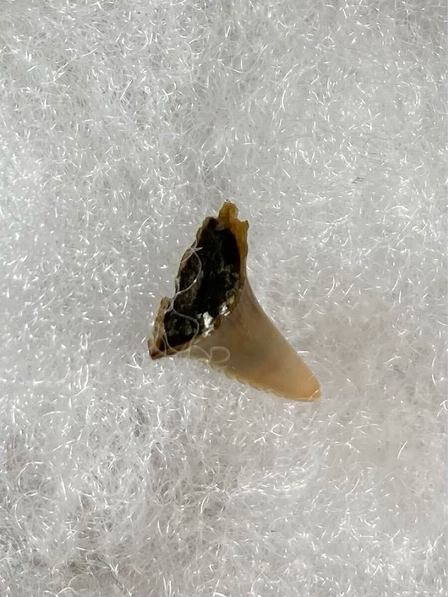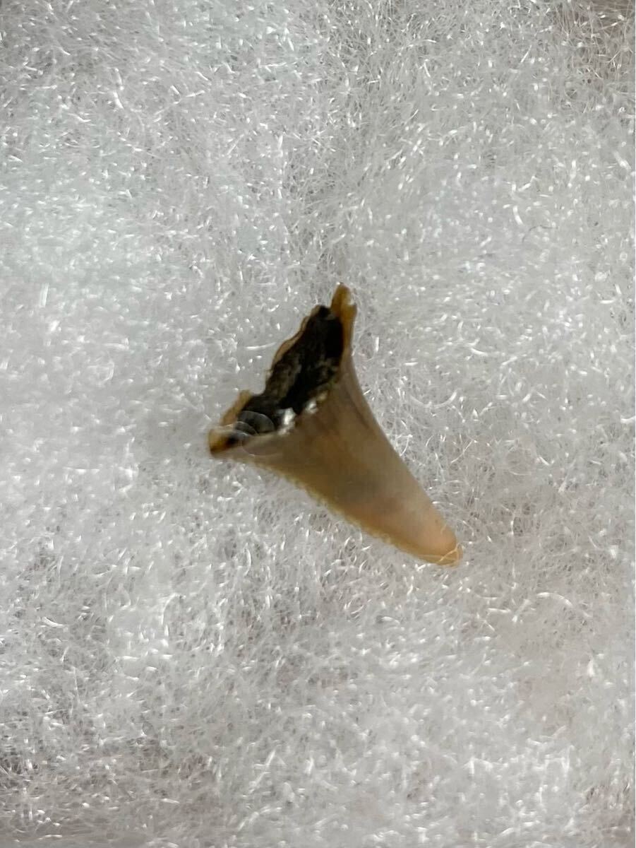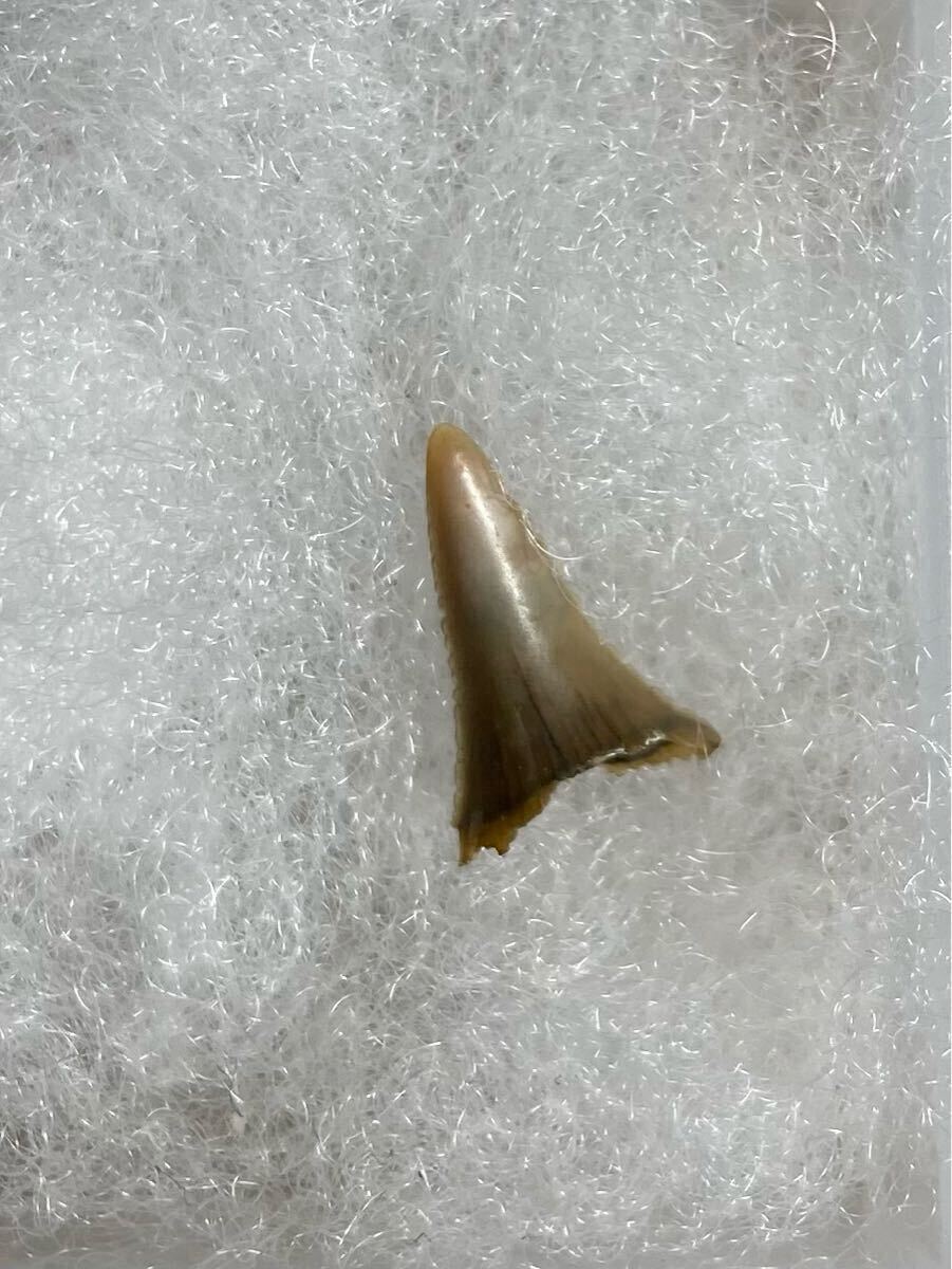 形態からホホジロザメ幼体の下顎歯ではないかと思われます。