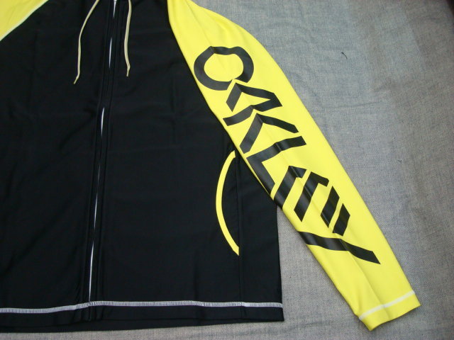 新品OAKLEY(オークリー)メンズRELOGO RASH HOODYLです、2011春夏モデルです、正式名は→RELOGO RASH HOODY 489015JPといいます!正式カラー名は→BLACK 001、ポリエステル84%、ポリウレタン16%です!このモデルはジャパンデザイン、モデルです!メンズのロングスリーブ(長袖)のラッシュパーカーです!2WAYストレッチの紫外線カットのUPF50の撥水、吸汗速乾素材を使用したラッシュガードフーディです!画像のように左袖に大きくロゴが入っています!そして勿論フロントにはポケット付です!夏場は海やプールにかかせない1品です!フルジップアップでフード付きのストレッチ素材で着心地も良いので、普段着て頂いても格好いい1品です!バックは無地です!このモデルは、MENS SURF/PEFORMANCEというカテゴリー!ラグラン袖です!背丈71.5cm、ゆき丈89cm、身幅57.5cm、ラッシュガードの素材なので結構伸びます!サイズはLサイズです、この商品は新品ですが、お店の展示品だった為、若干の汚れや黄ばみなどある箇所があるかも知れませんが、ご了承、ご理解下さい!自分が見る分には大丈夫そうですが、年式が古いので、商品が経年劣化している部分がある場合がございますが、予めご理解頂いた上、ご購入して頂けましたら幸いでございます。なお、別アカウント(IDlipelalaでも商品の方、出品させて頂いておりますので、もし宜しければ、ご覧頂けましたら幸いでございます!色の方は、各パソコン、デジカメによって多少異なりますので、ご了承下さい、ノークレーム・ノーリターンでお願いいたします。ご質問に関しましては、火曜日を除く、午後12~午後9(21)時までに、お早めにお願い致します。この商品以外も、その他、色々出品しておりますので、是非ご覧下さい。