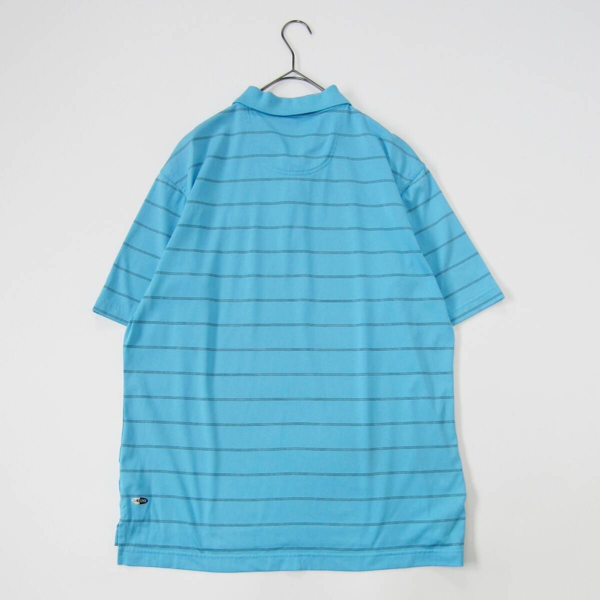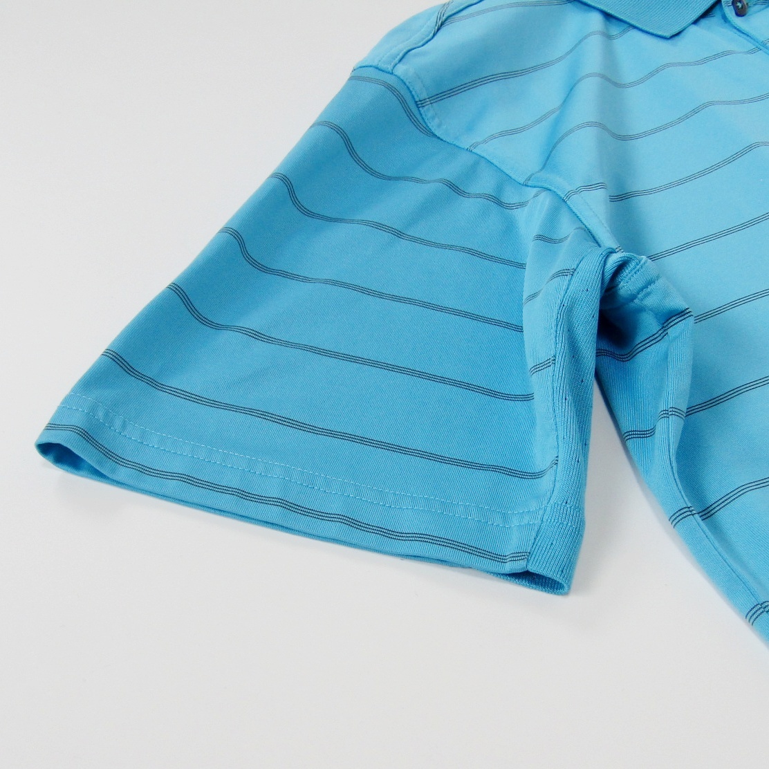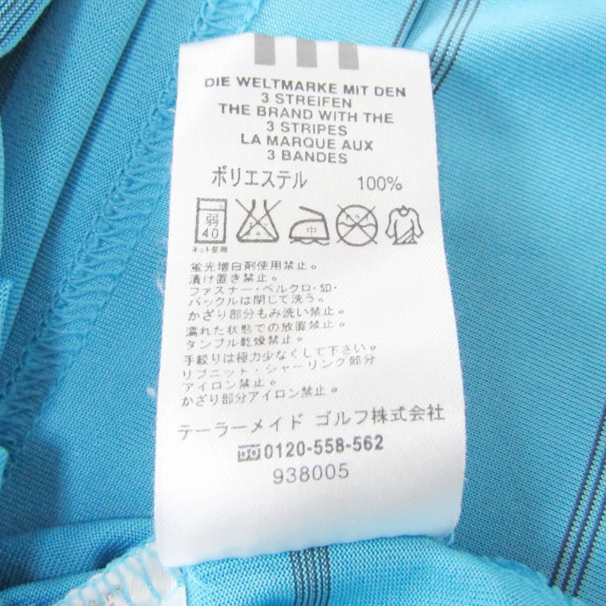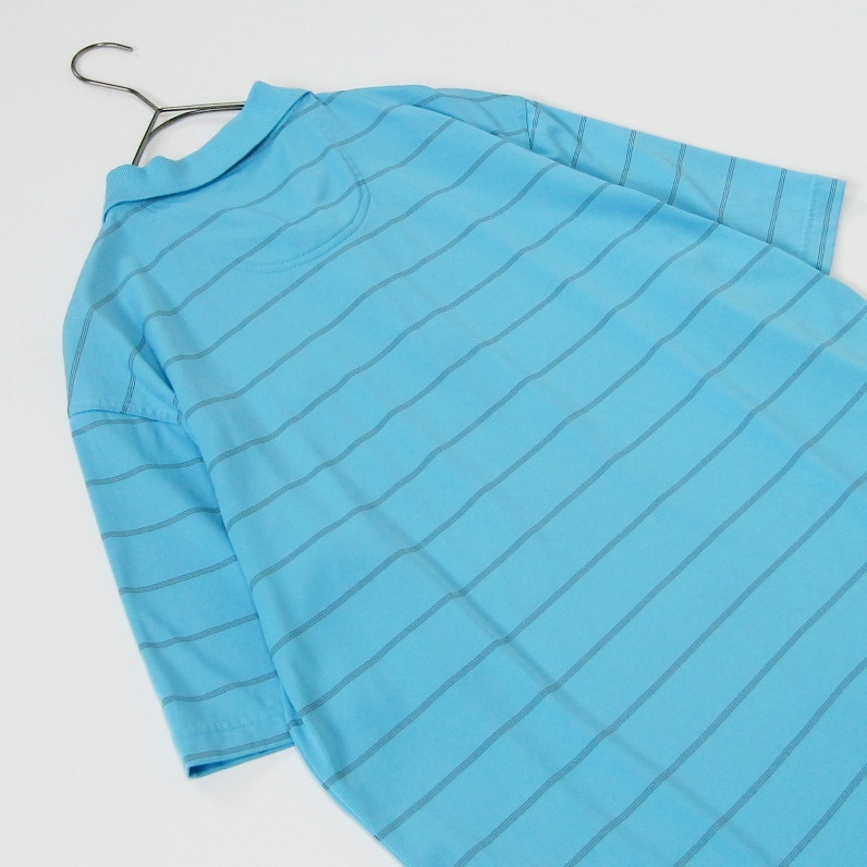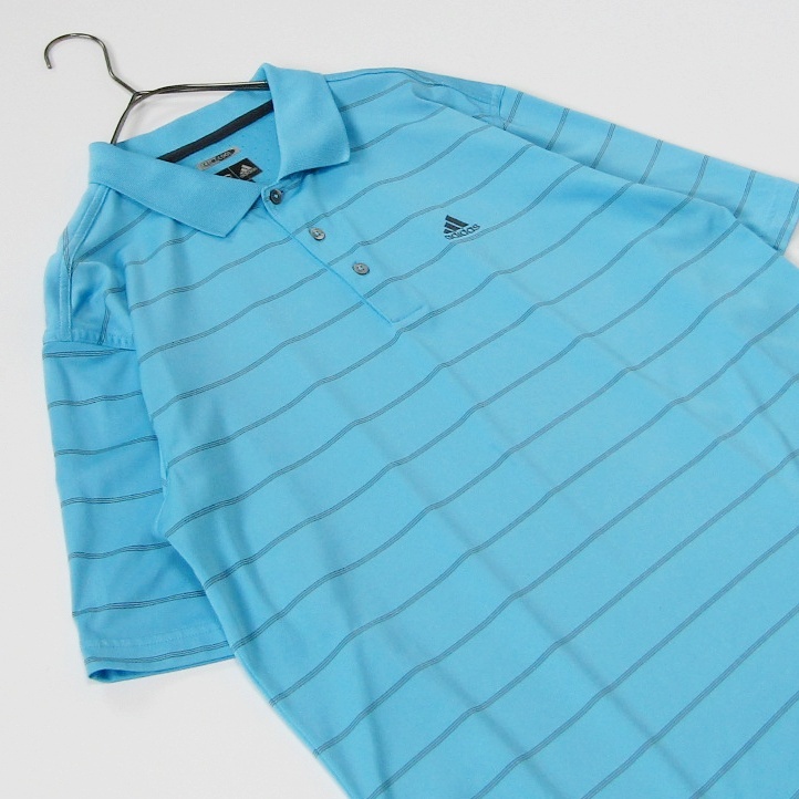 水色のストライプデザインのadidasポロシャツ。