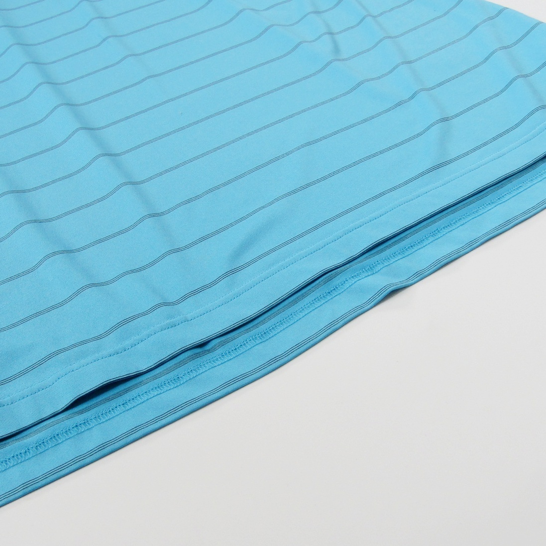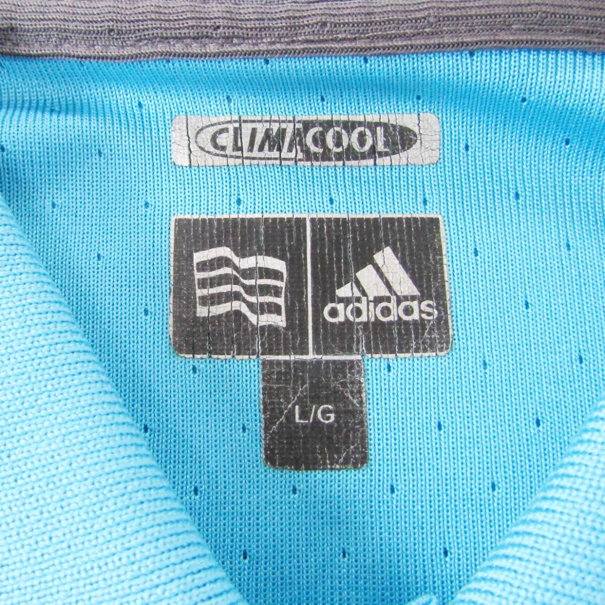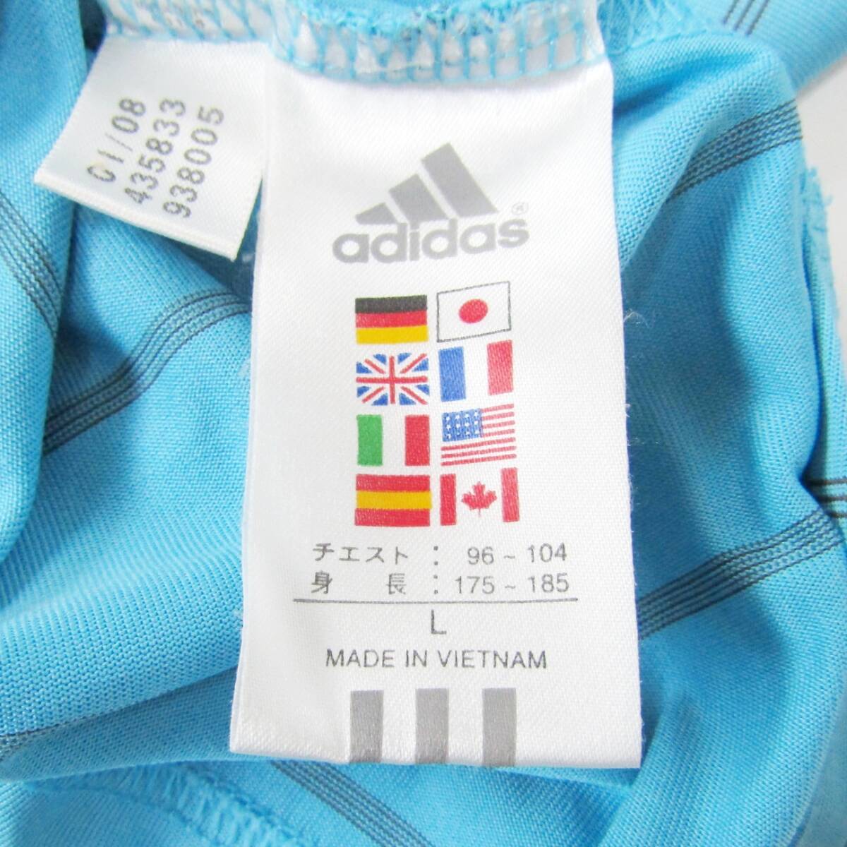 水色のストライプデザインのadidasポロシャツ。
