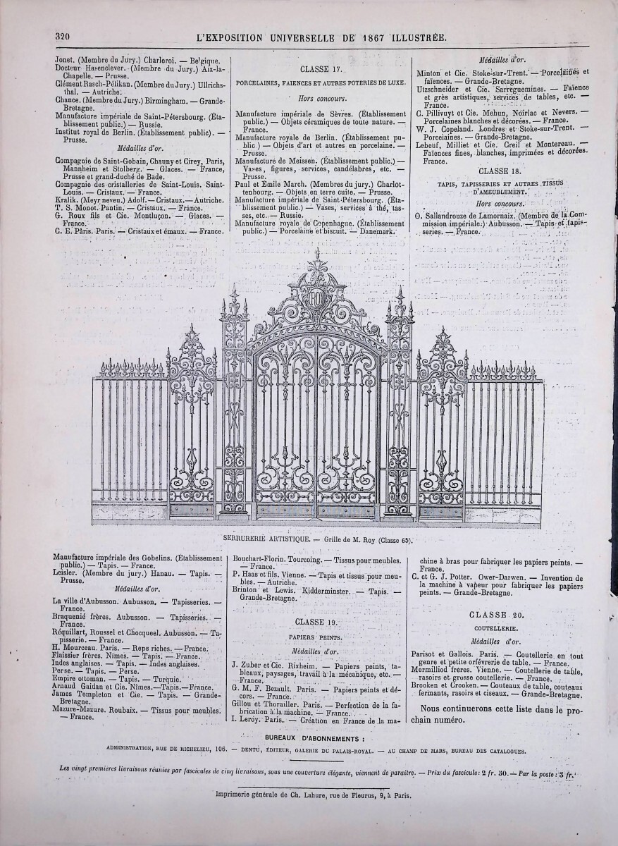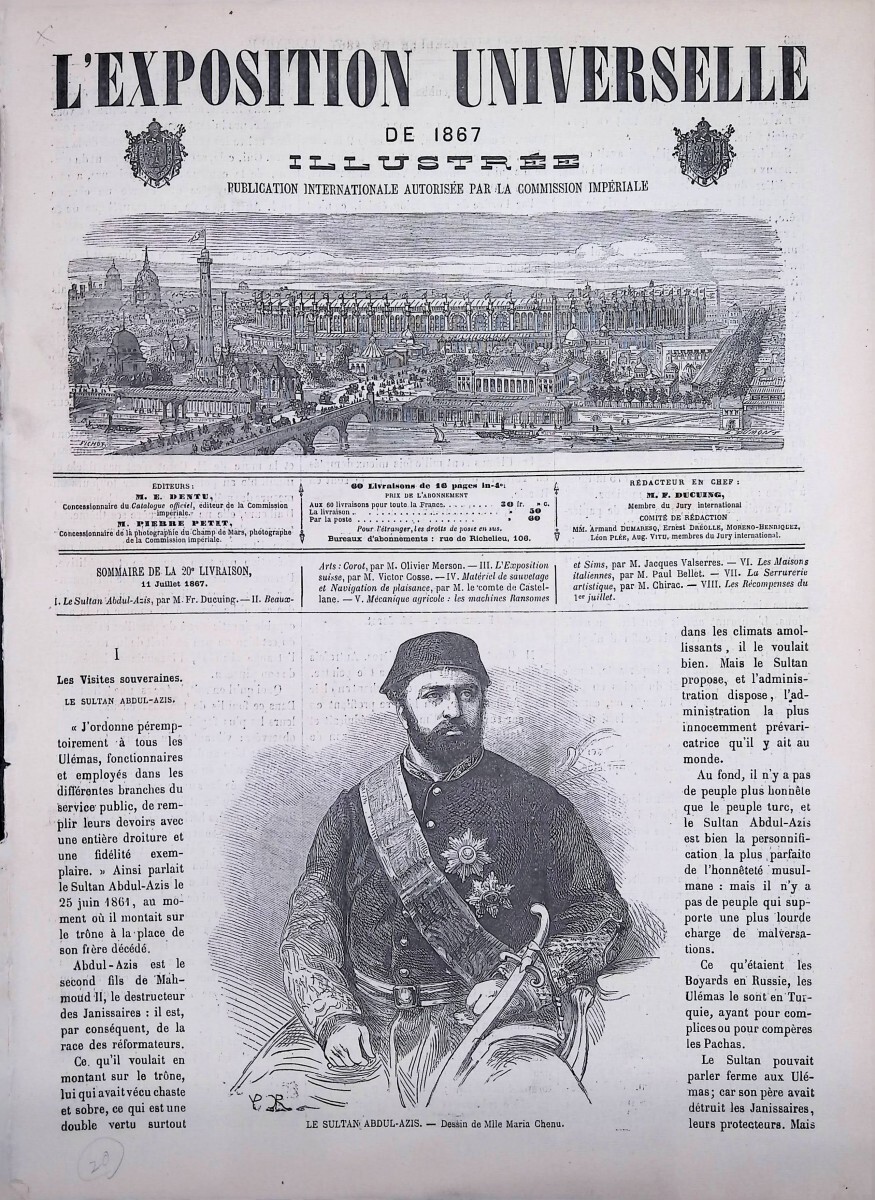 1967年パリで開催された万国博覧会に日本から幕府、薩摩藩、佐賀藩が参加出展しました。この博覧会期間中、週刊で特集号が出版されました。各号は、会場の案内や、参加出展の概要等が美しい木口木版画で紹介されています。各号は、12ページで構成されています。また、サイズは、27cmx37cmです。