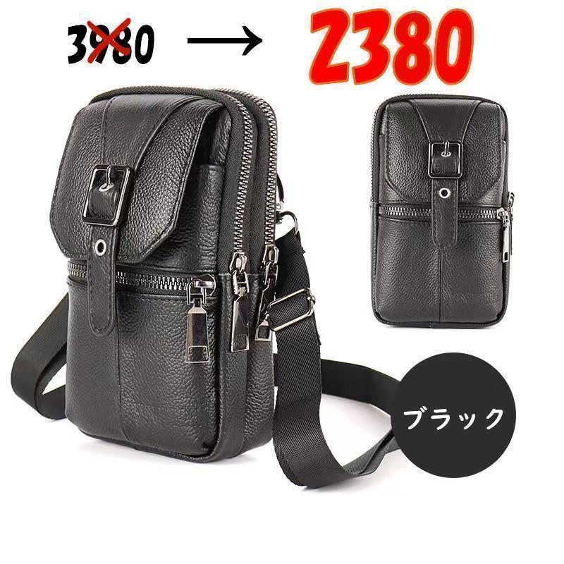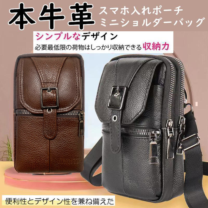 メンズ用 本革 牛革 スマホポーチ 大容量 買い物 ショルダーバッグ ブラック