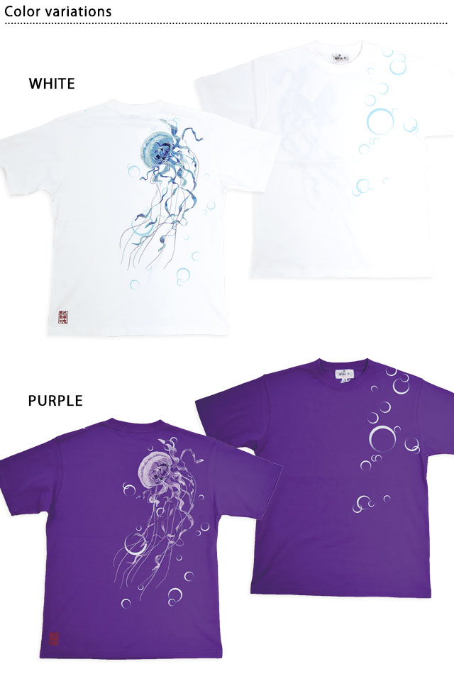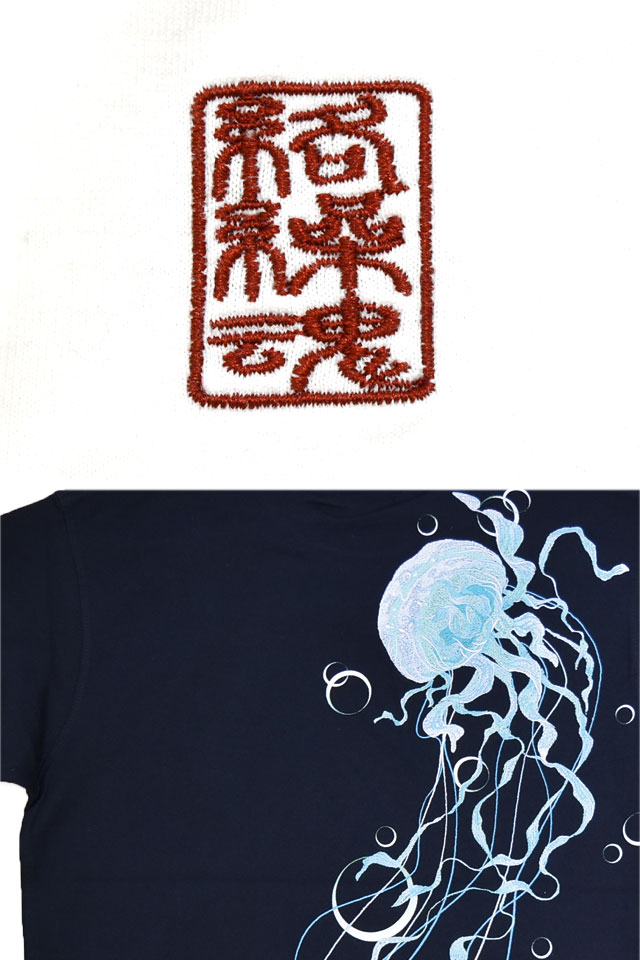 絡繰魂さんから「麗しくらげ半袖Tシャツ(252030)」のご紹介です。 くらげをモチーフの主役に採用した、清涼感溢れる半袖Tシャツです。 背中にはくらげを刺繍。 それぞれのボディーカラーに合わせて、用いる色味にも変化を持たせました。 裾にはブランドロゴが印風に刺繍されています。 背景には泡を、こちらはプリントで表現しました。 ボディーには、刺繍に負けないコシのある綿100%のTシャツ生地を採用。 是非背中の柄を見せて着こなして頂きたい逸品です。 | |||||||||||||||||||||||||