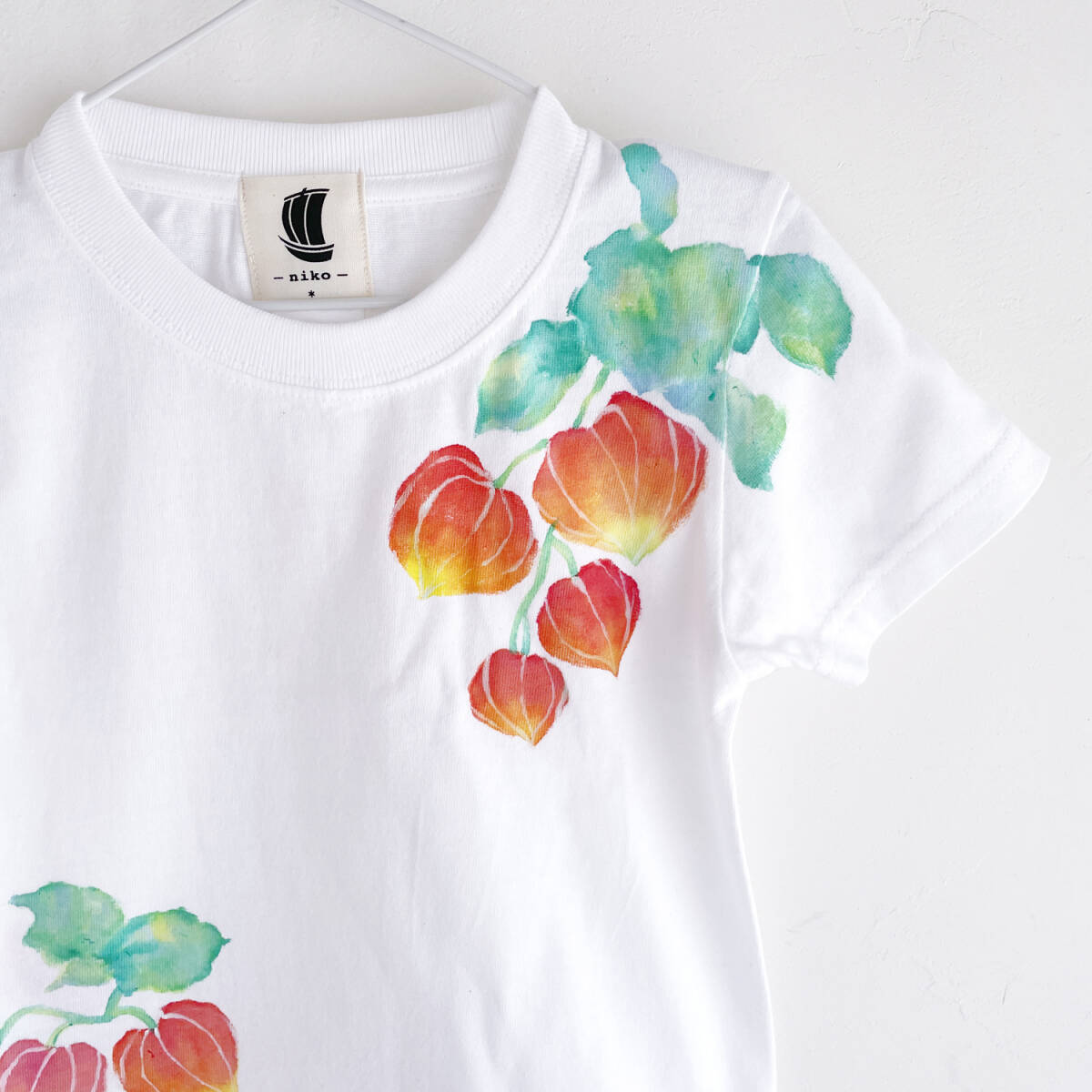 ハンドメイド 手描きTシャツ キッズTシャツ ホオズキ柄Tシャツ 手描きで描いた、鬼灯のTシャツ ホワイト | |||