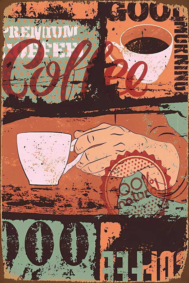 「Premium Coffee」「Good Morning」「100% Natural」などの文字が重なり合い、ヴィンテージ加工が施されたおしゃれなデザイン。