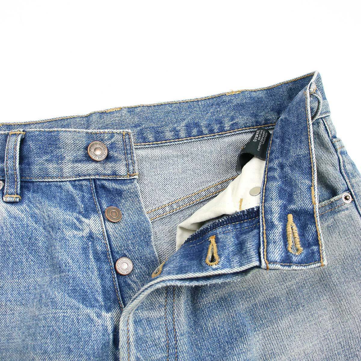 腿・前裾付近にシミ、全体的に色褪せがある他、デザイン加工を残して裾上げ加工が施されております。