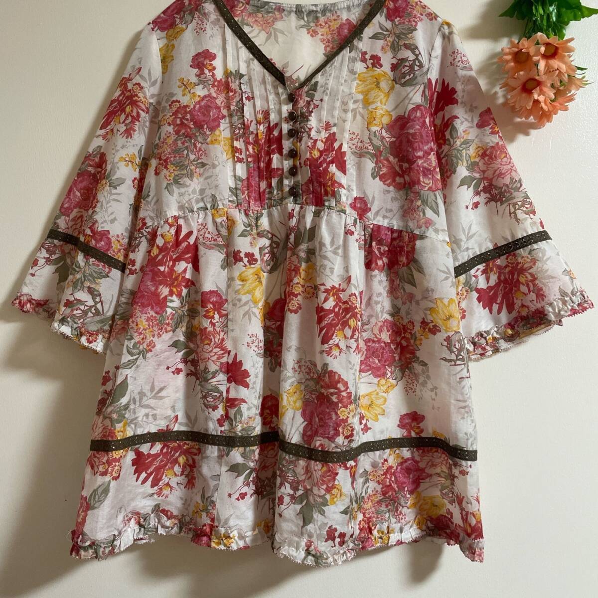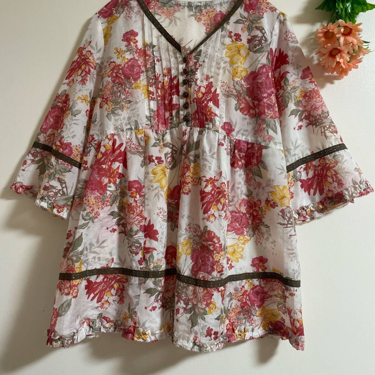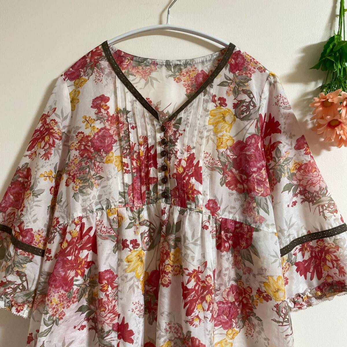 【PLIDOUL】 5分袖カットソー (S) チュニック 花柄 赤 白 美品 ふんわり 体系カバー
