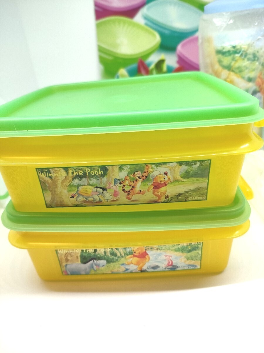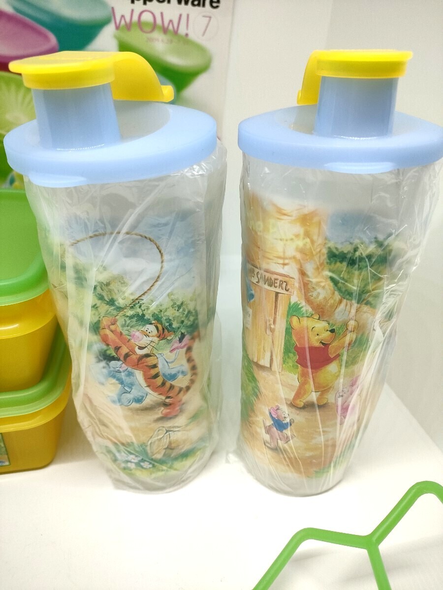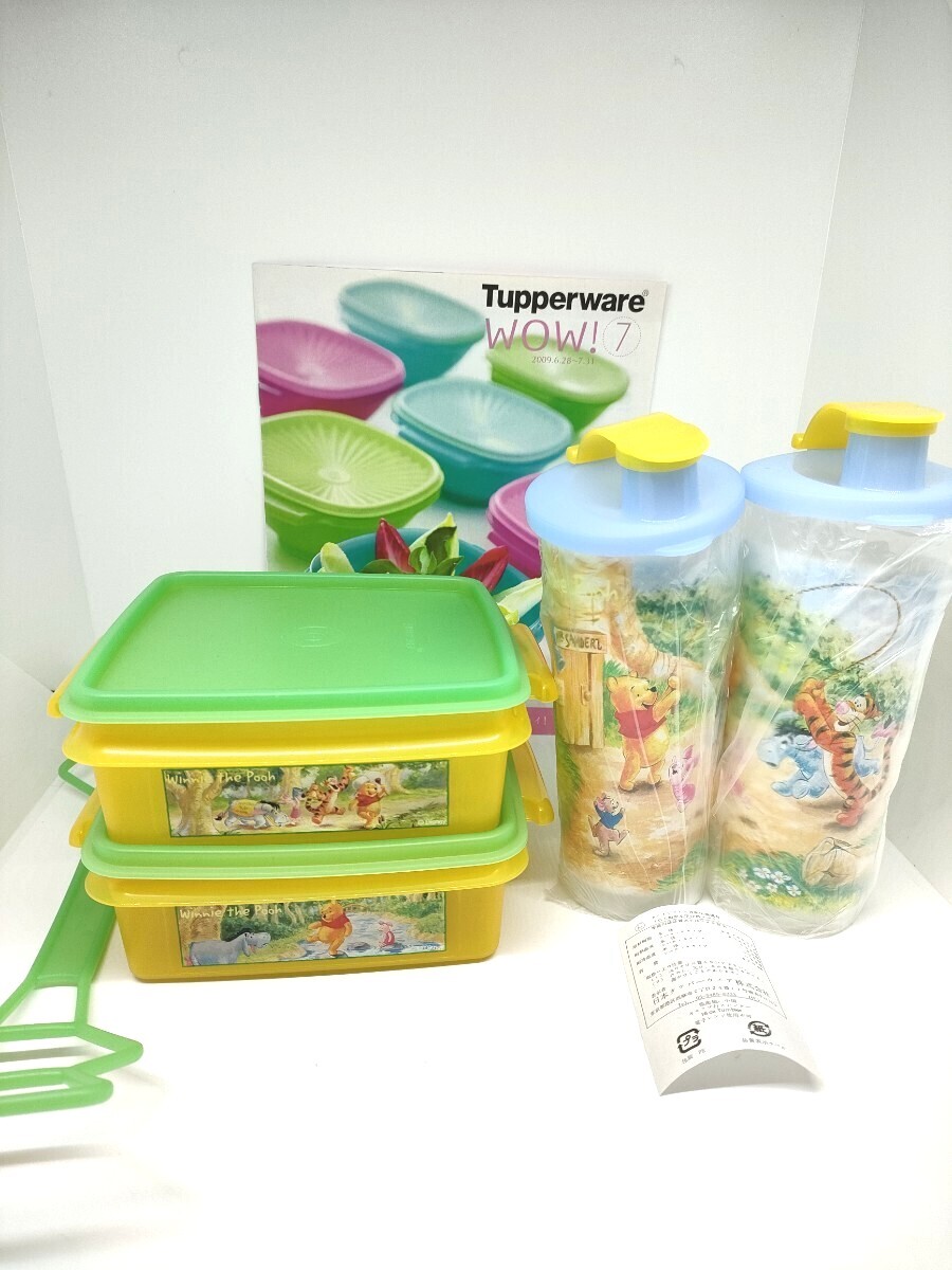 ◆廃盤品◆タッパーウェア【ディズニーくまのプーさんハンドル付デュエット2段弁当+キャップ付スレンダーボトル水筒2本】ピクニックセット