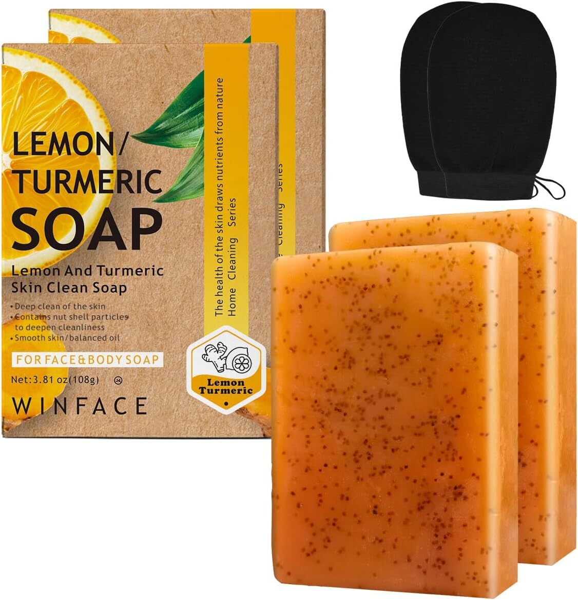 2個セット レモン石鹸、ウコン石鹸、複数の植物エキスを添加して肌をケア、ボディ用、入浴、ハンドソープ108g、専用手袋付き、