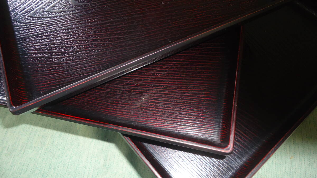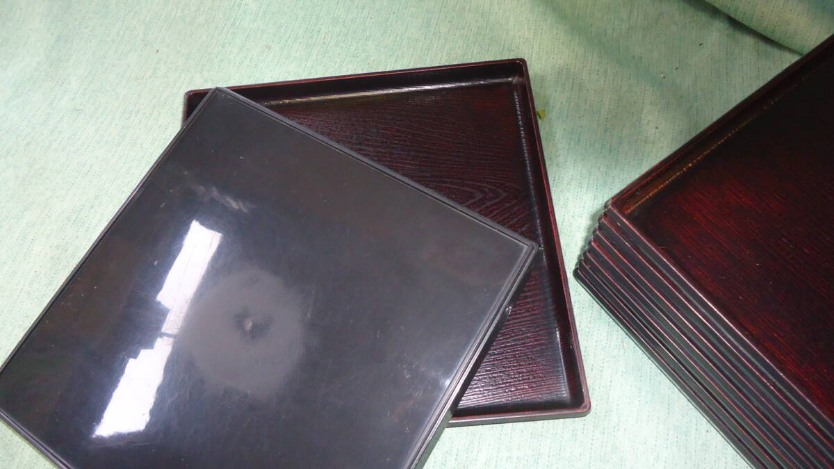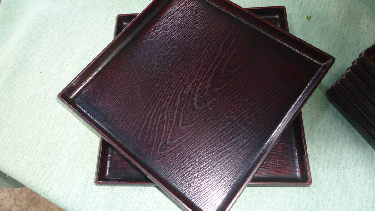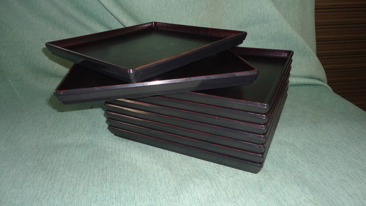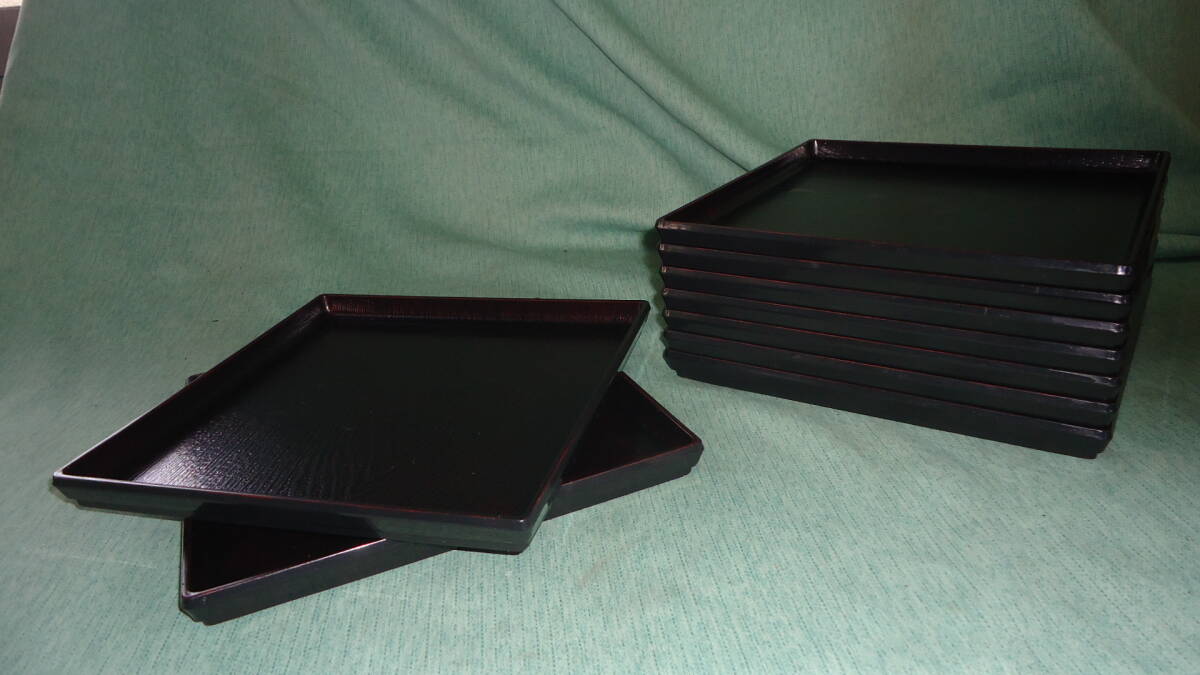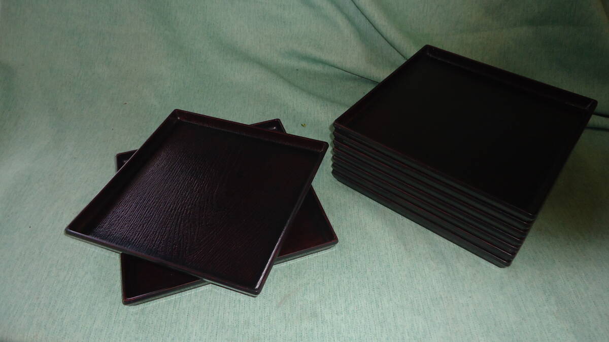ABS樹脂製の木目模様の正角盆(木目調・黒色8枚・茶色1枚)を9枚セットにして出品しております。