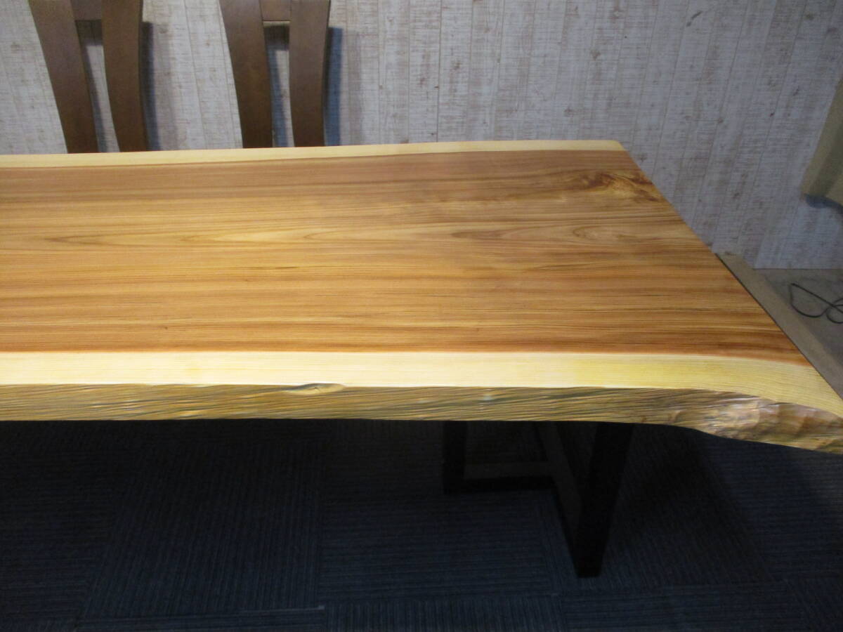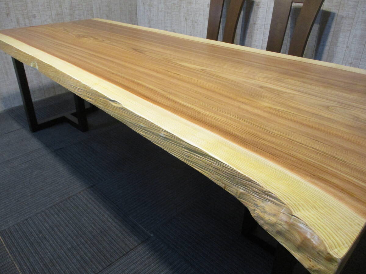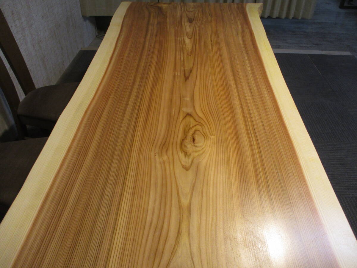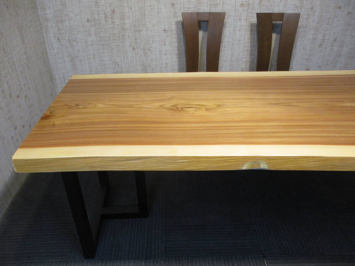 杉の一枚板無垢のテーブルです。耳のきれいなテーブルです。これは成長段階で、幹回りを保護して、皮の部分がきれいに育つように整えたものです。手を加えずに自然のまま仕上げています。全体的に、目立つ大きな節や節穴もなく、裏面もきれいです。