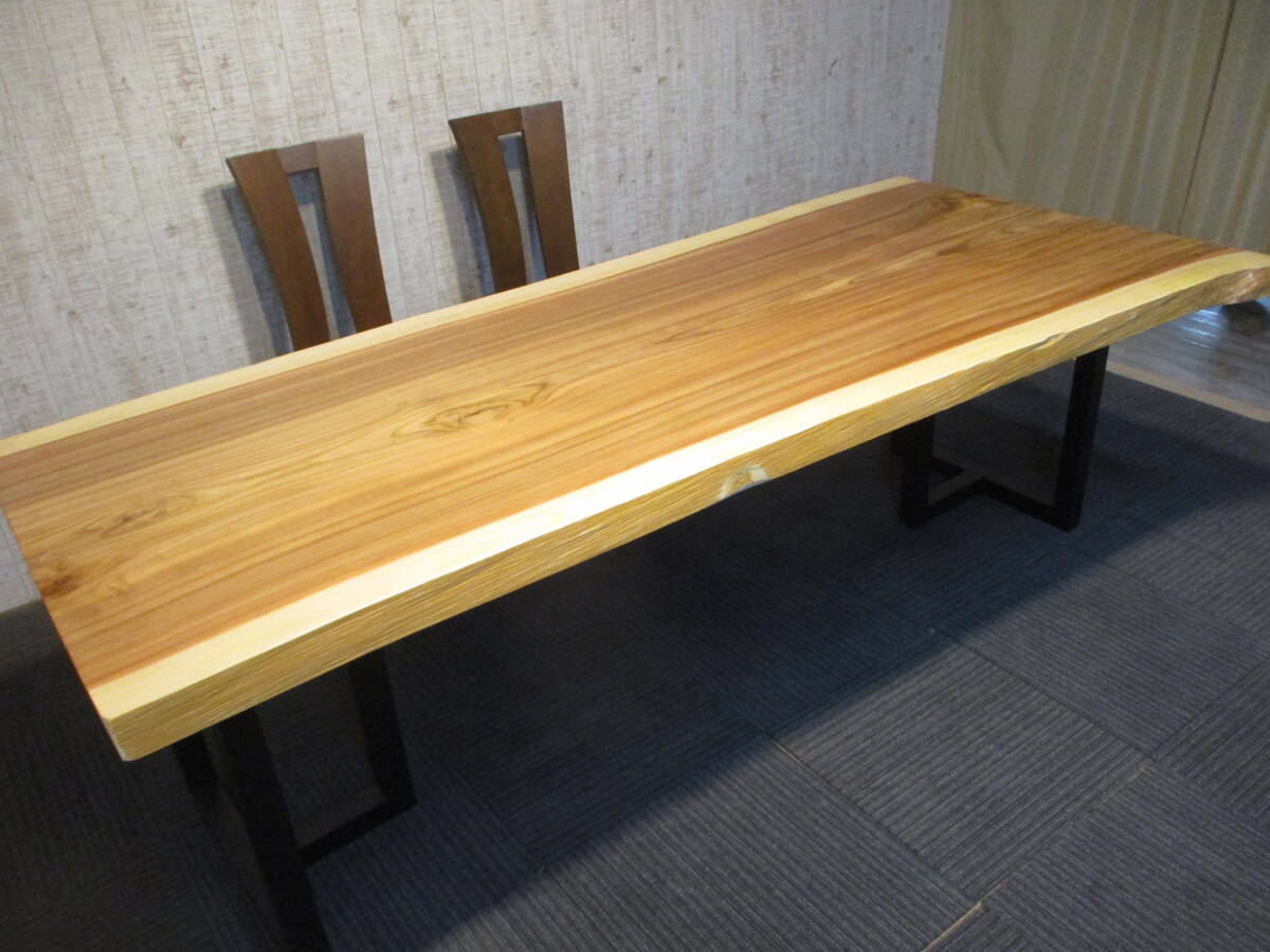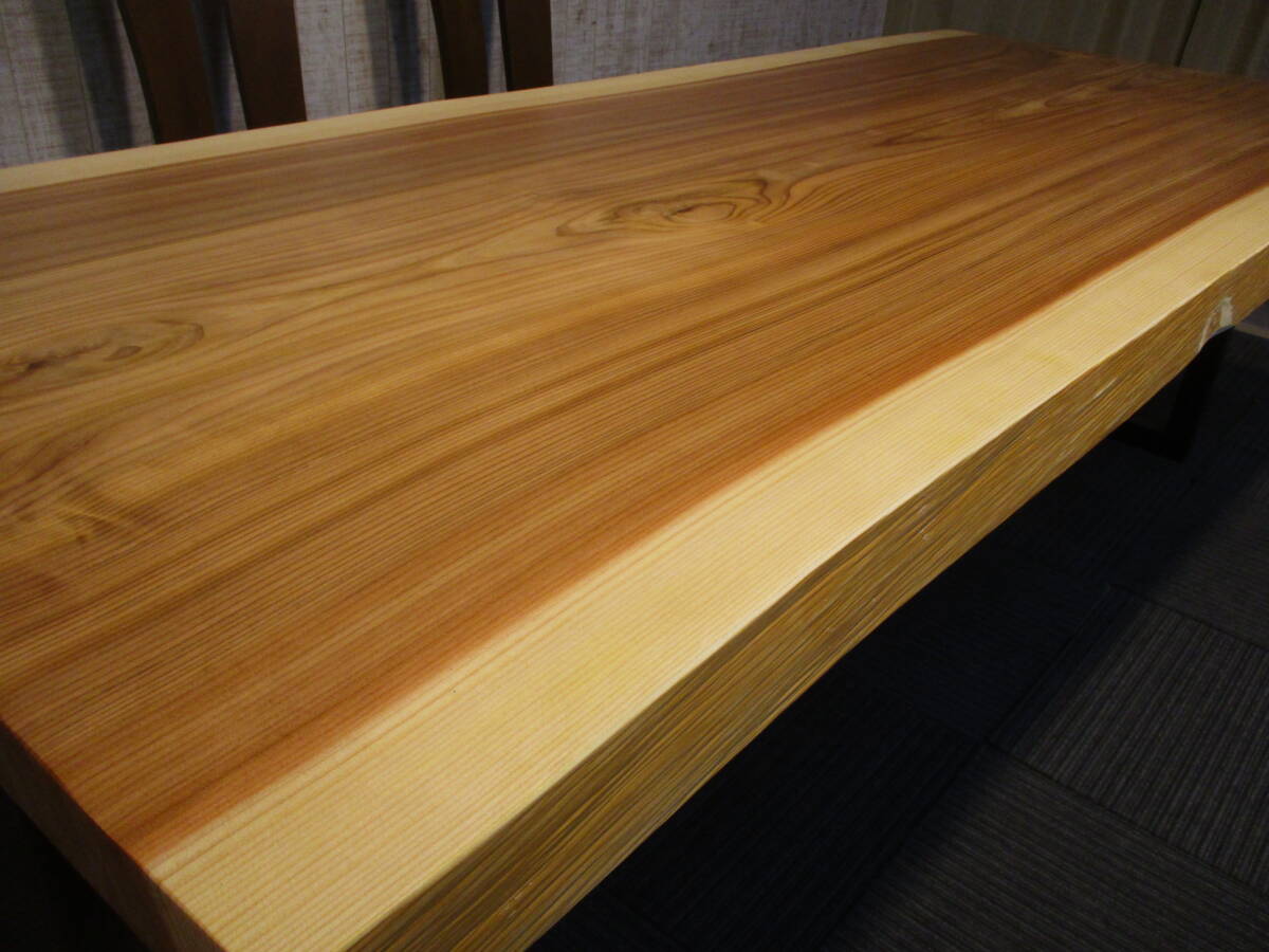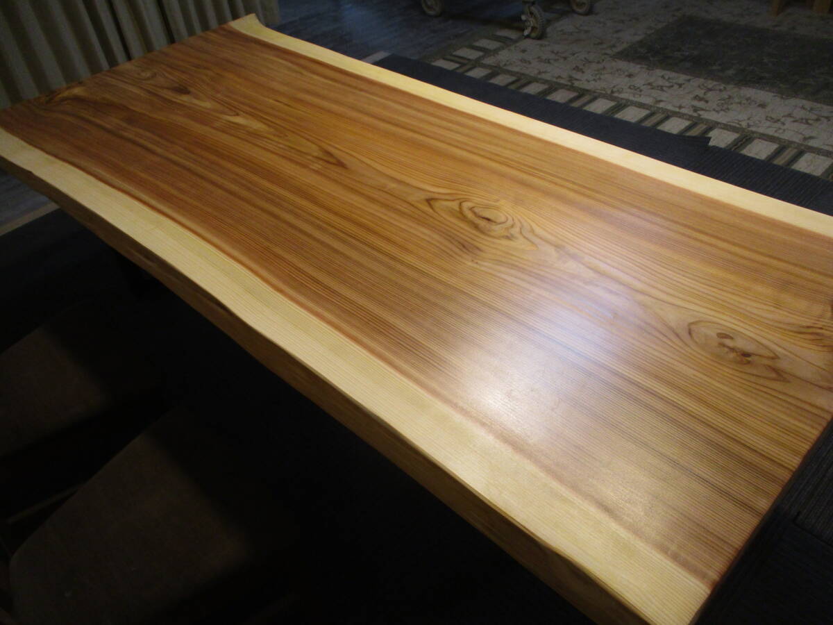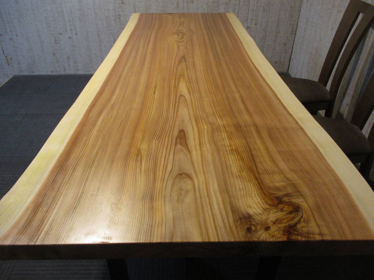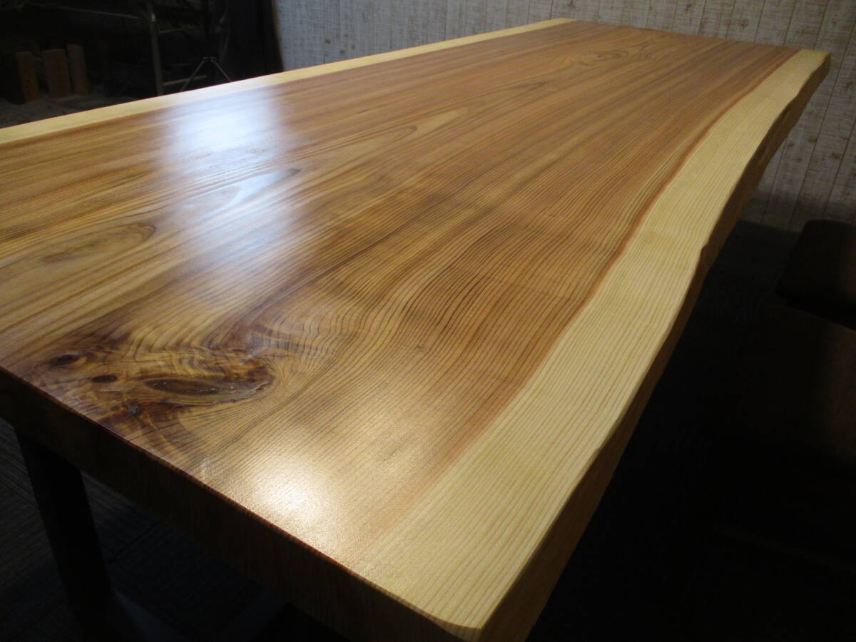杉の一枚板無垢のテーブルです。耳のきれいなテーブルです。これは成長段階で、幹回りを保護して、皮の部分がきれいに育つように整えたものです。手を加えずに自然のまま仕上げています。全体的に、目立つ大きな節や節穴もなく、裏面もきれいです。