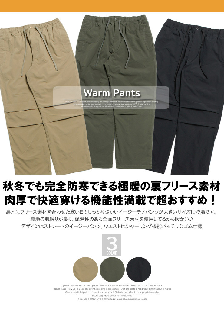 | 商品説明 | 裏地にフリース素材を合わせた寒い日もしっかり暖かいイージーチノパンツが大きいサイズに登場です。 |