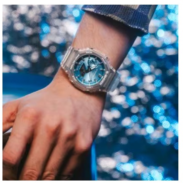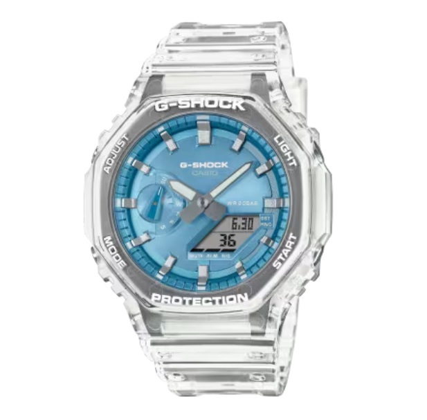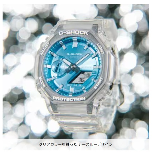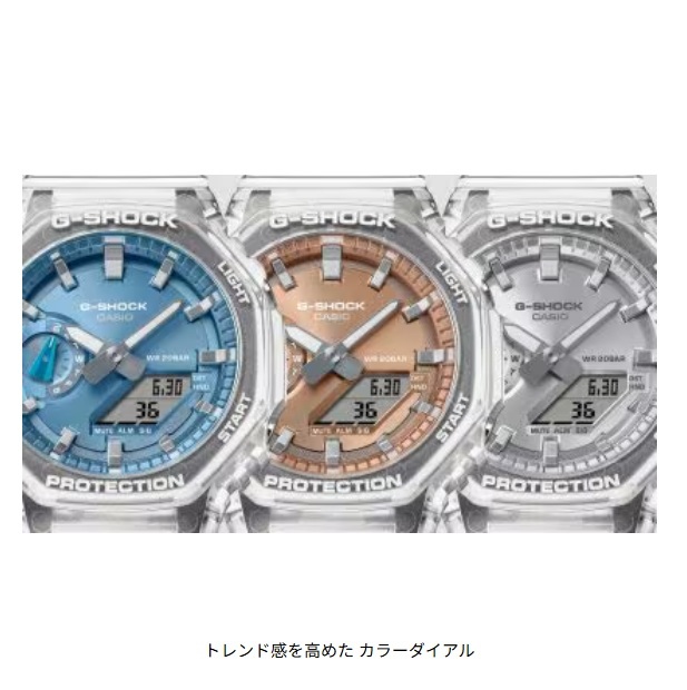 タフネスを追求し進化を続けるG-SHOCKから、ダイアルを鮮やかなメタル蒸着塗装で仕上げたモデルです。ベースモデルはオクタゴンベゼルのGA-2100を採用。文字板に人気のカラーリングであるメタル蒸着塗装を施し、ベゼルとバンドはスケルトン素材にすることでサマーシーズンに向けた涼しげな印象に仕上げました。ストリートファッションにも最適なカジュアルでスタイリングのアクセントとして活用しやすいカラーモデルです。